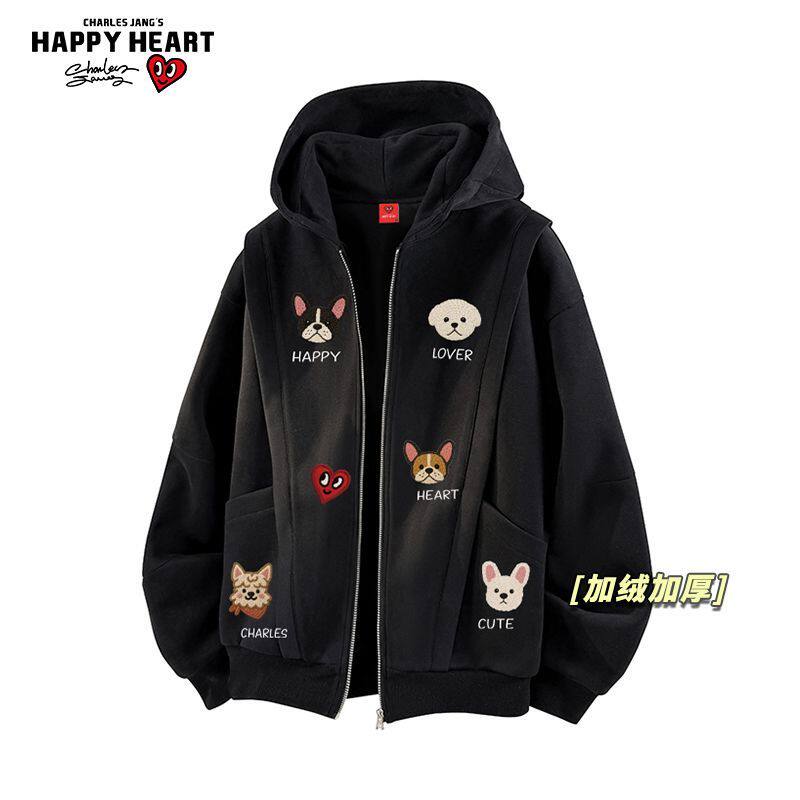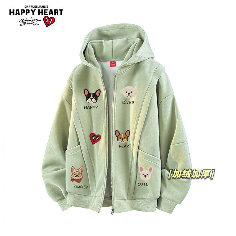 查尔斯桃心小狗印花开衫加绒加厚休闲卫衣男