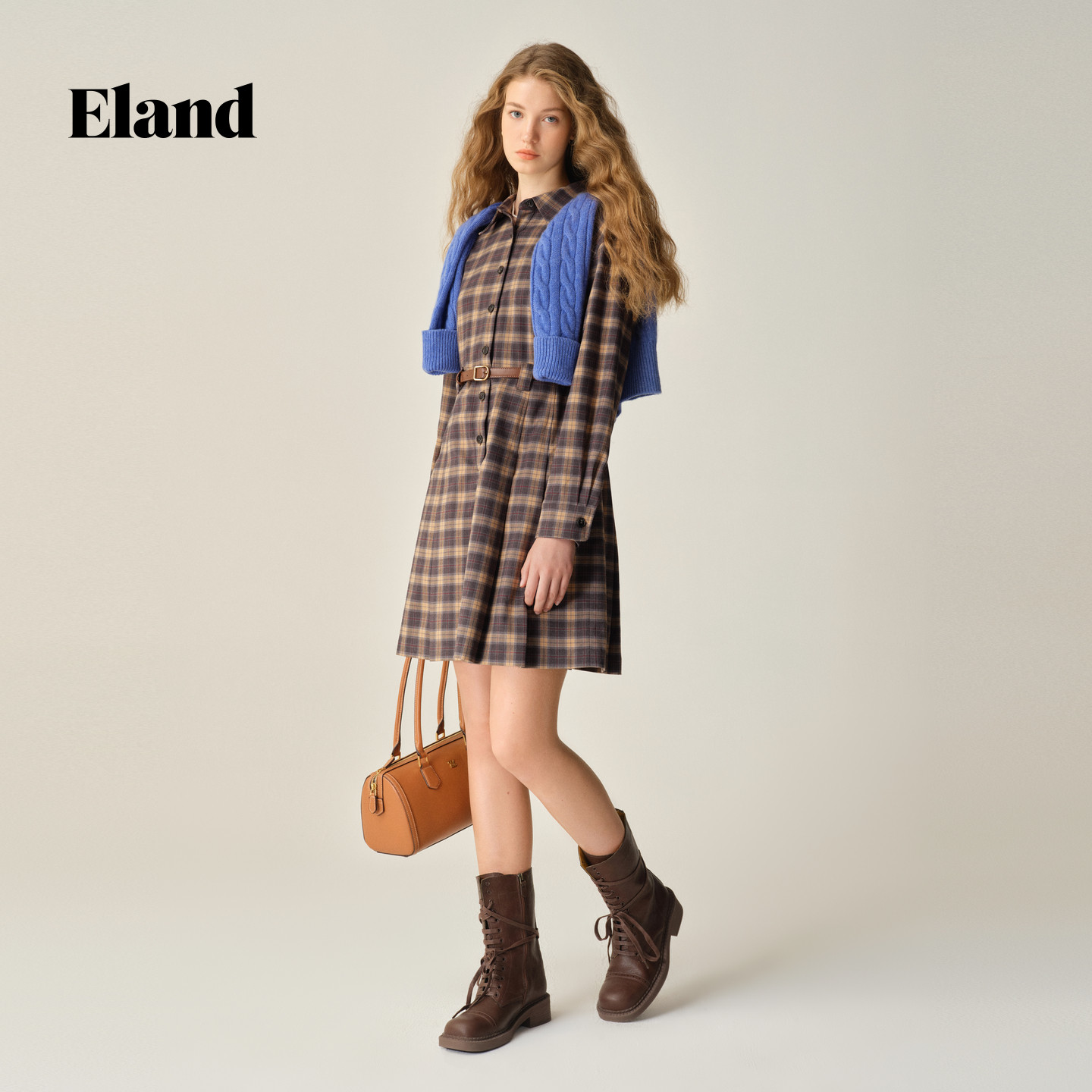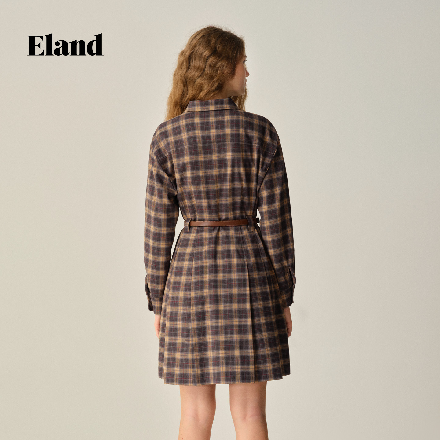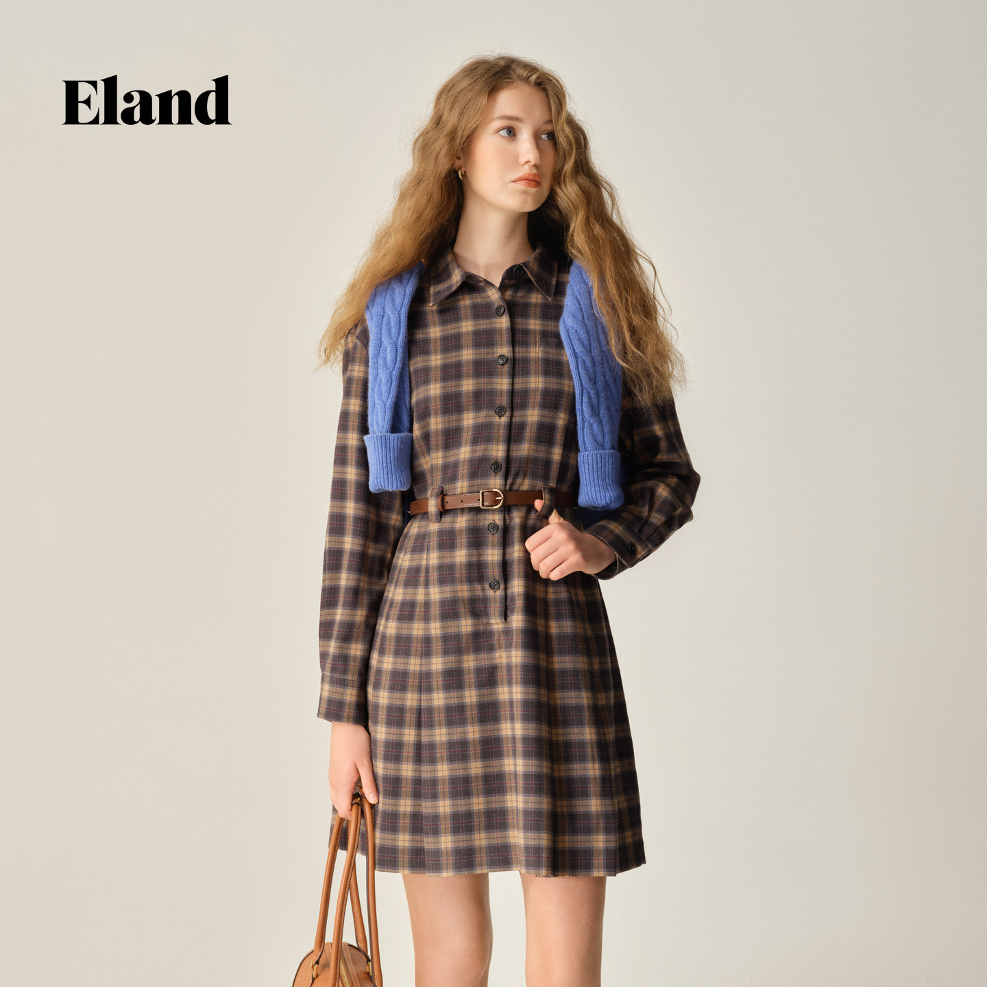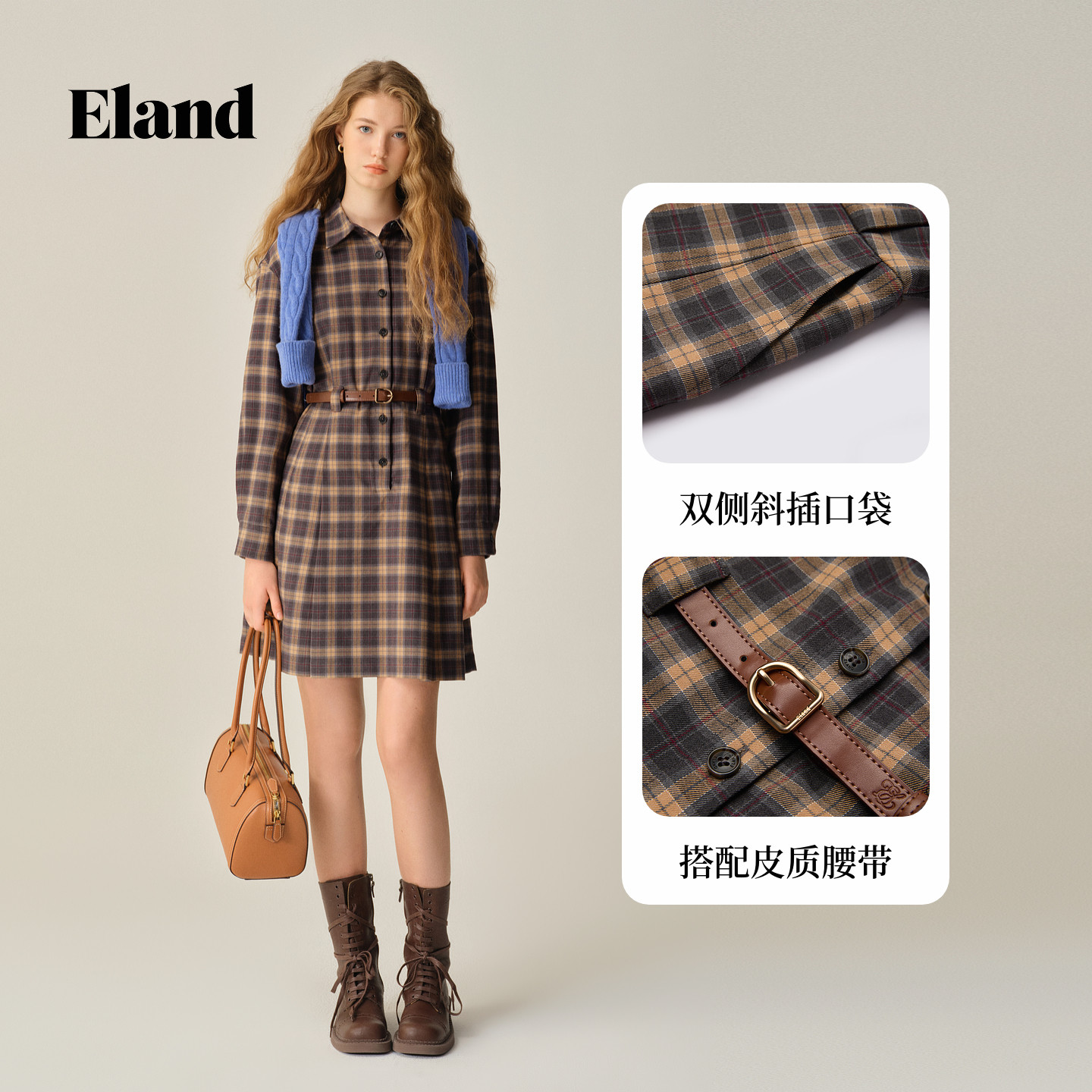 Eland衣恋连衣裙女收腰翻领衬衫式格纹裙2025冬季新款