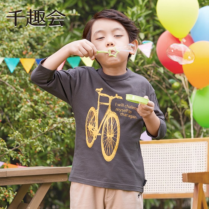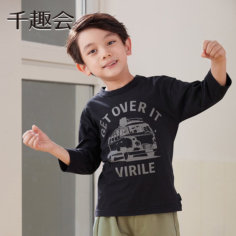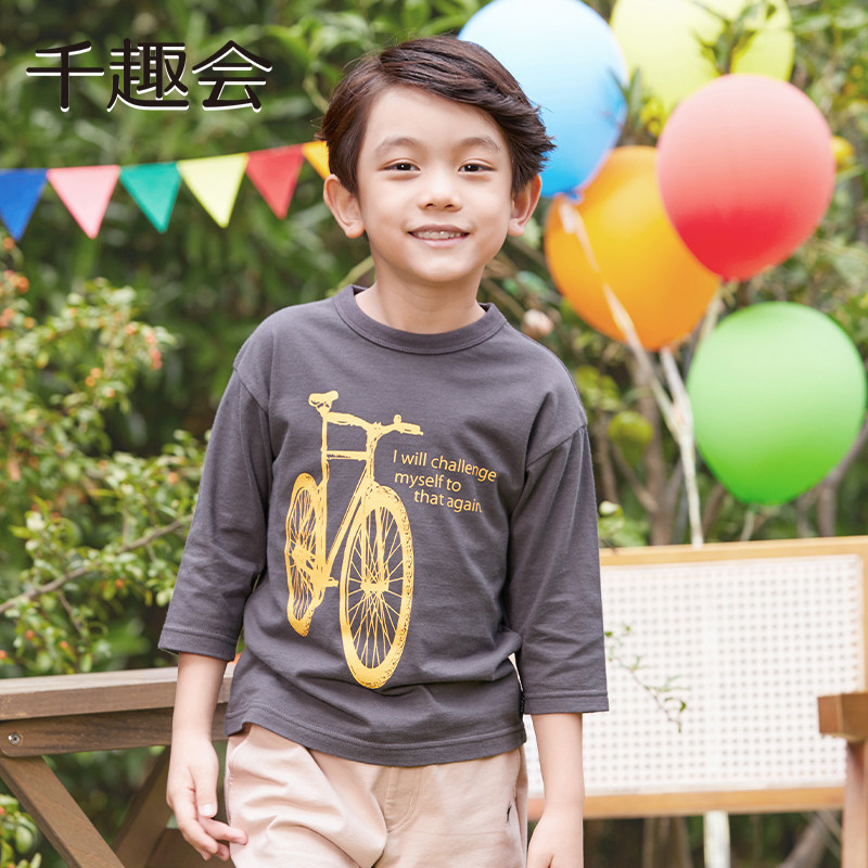 千趣会童装25春秋款男童时尚机车印花上衣棉质针织儿童七分袖T恤