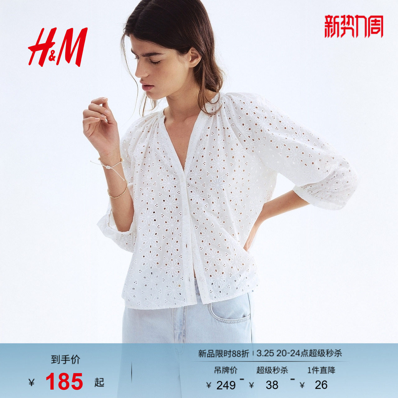 HM女装衬衫春季灯笼袖潮流时尚休闲镂空刺绣上衣1294732
