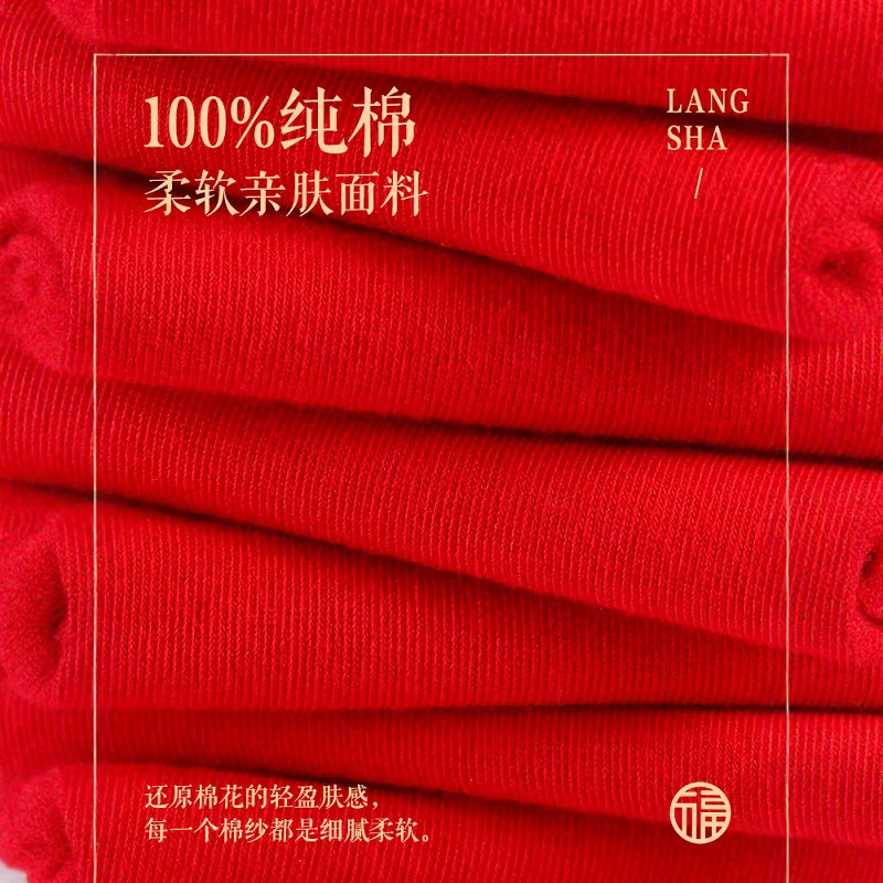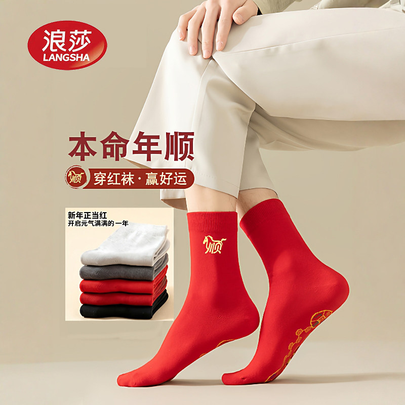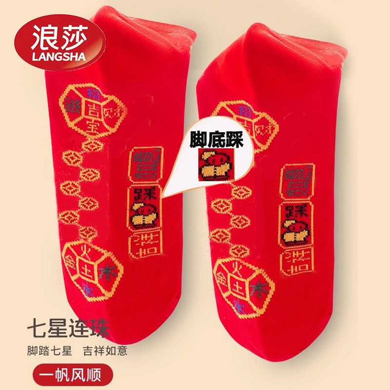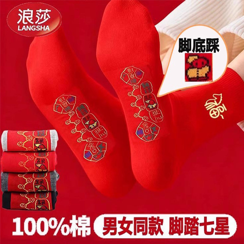 浪莎本命年红袜子男士纯棉脚踩七星连珠小人图案冬马年女红色袜子