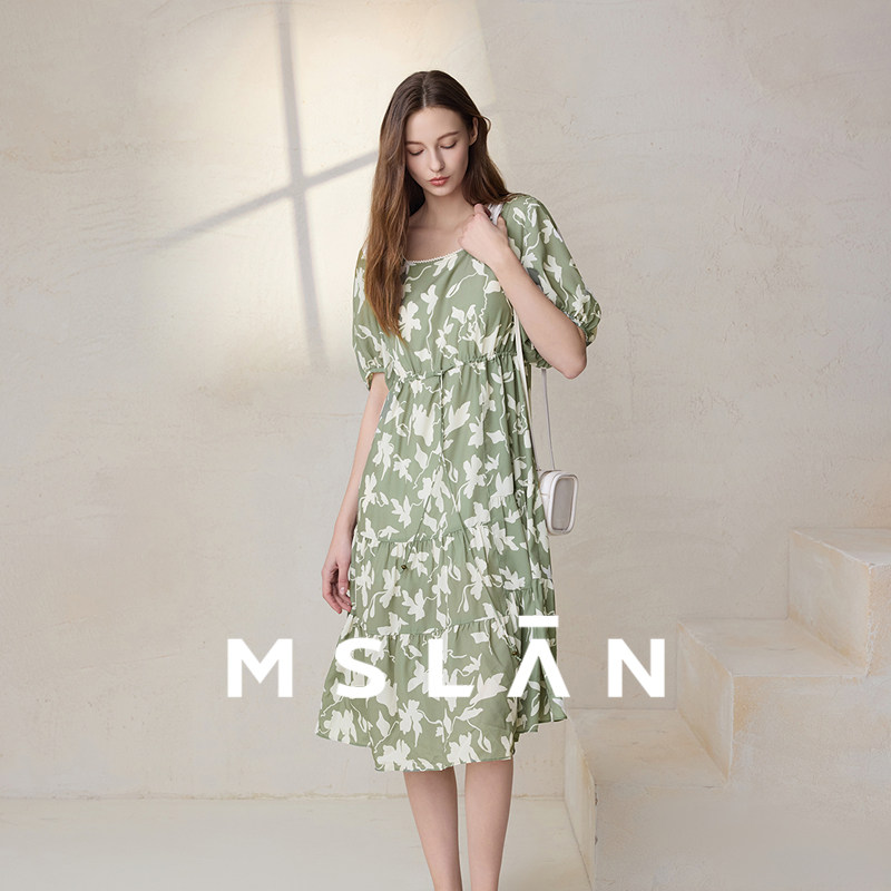 MSLAN南法风连衣裙 夏季法式方领印花泡泡袖收腰