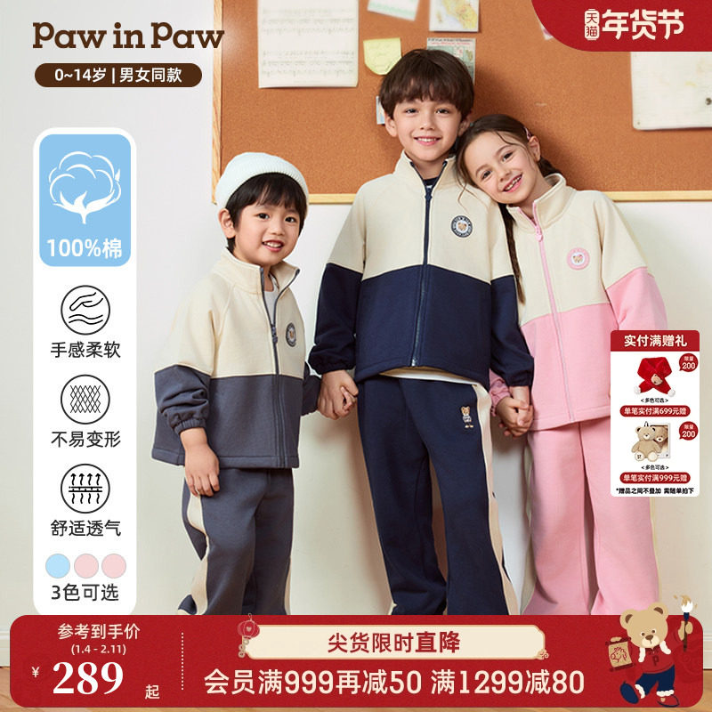 PawinPaw卡通小熊童装25年秋冬新款男女童撞色拼接纯棉运动套装