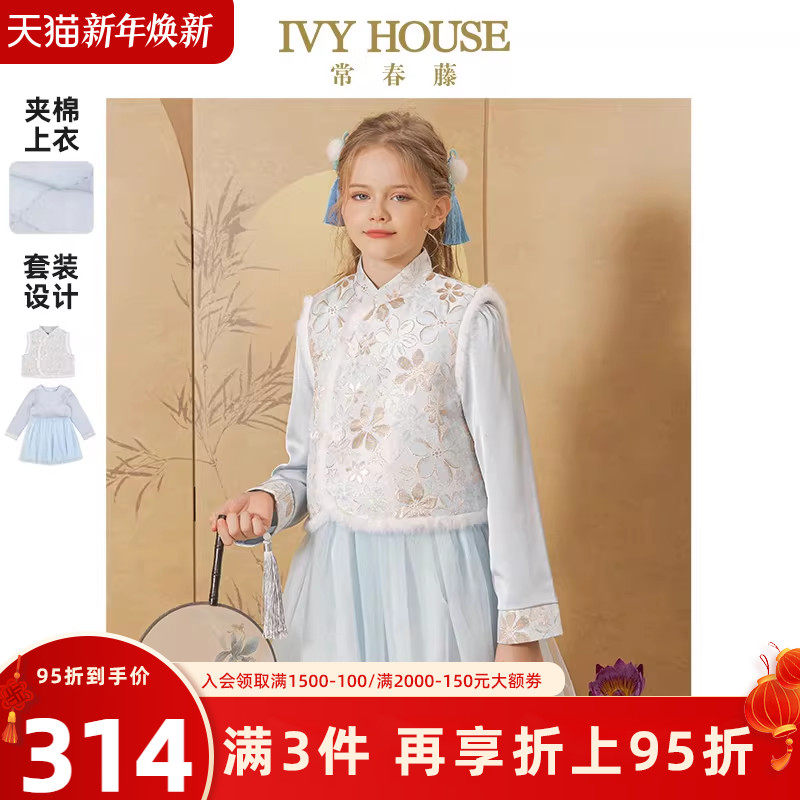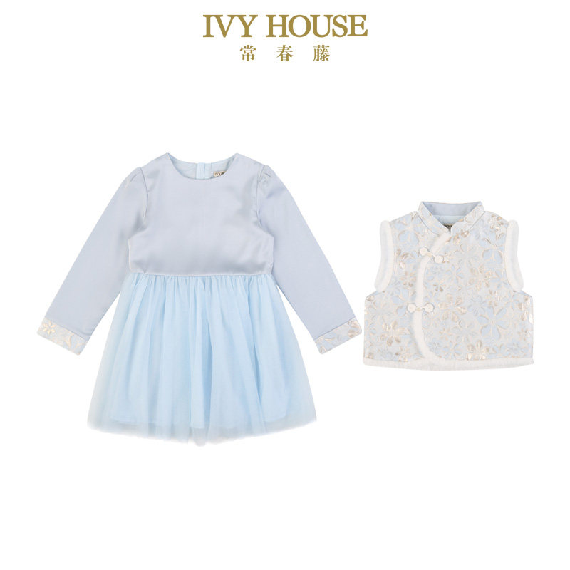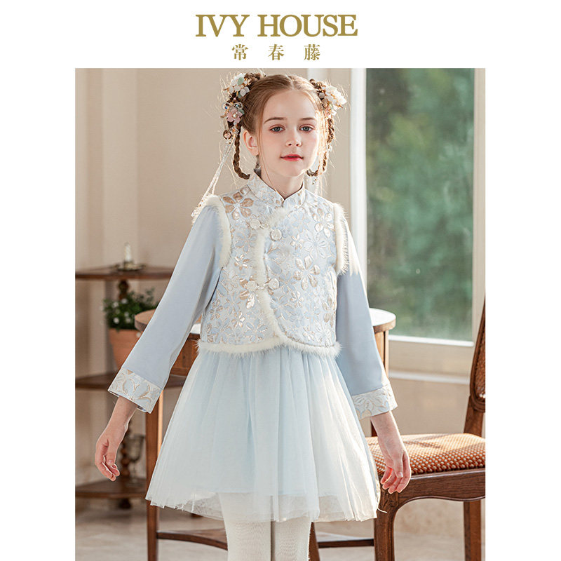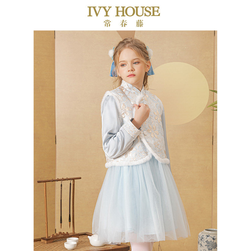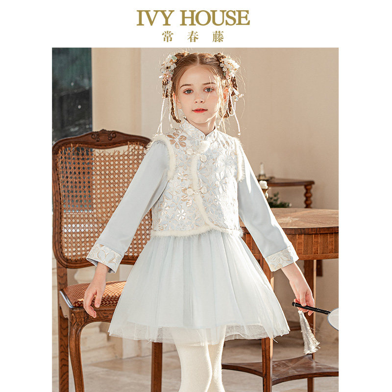 IVY HOUSE常春藤童装女童套装冬季款 国风网纱连衣裙马甲两件套