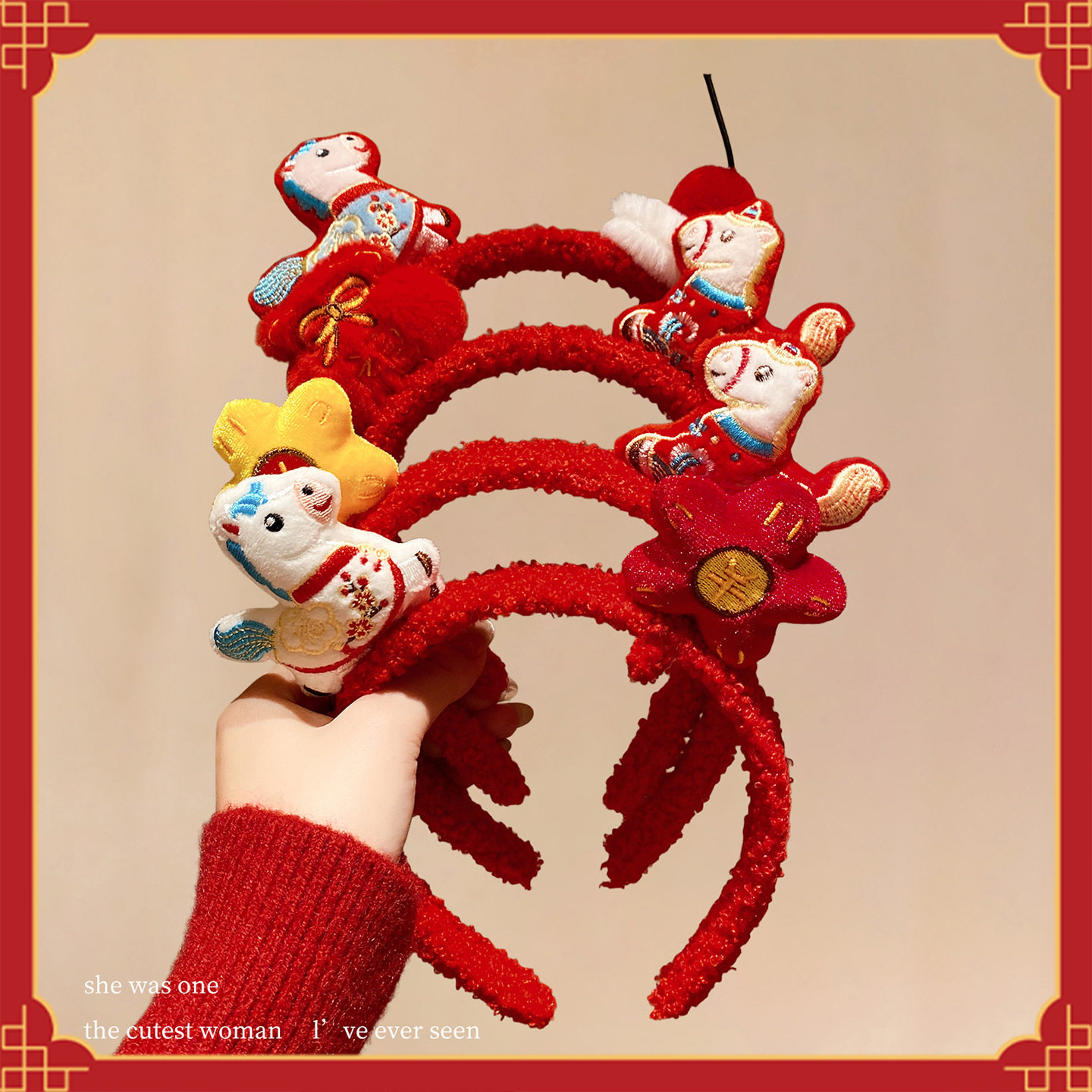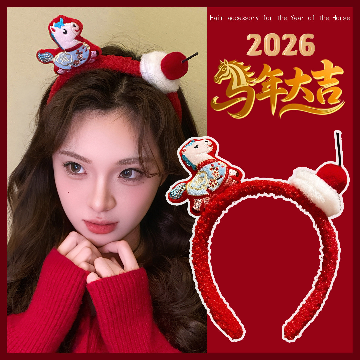 新年红色毛绒发箍可爱小马福字头饰拍照节日氛围感发饰女款饰品
