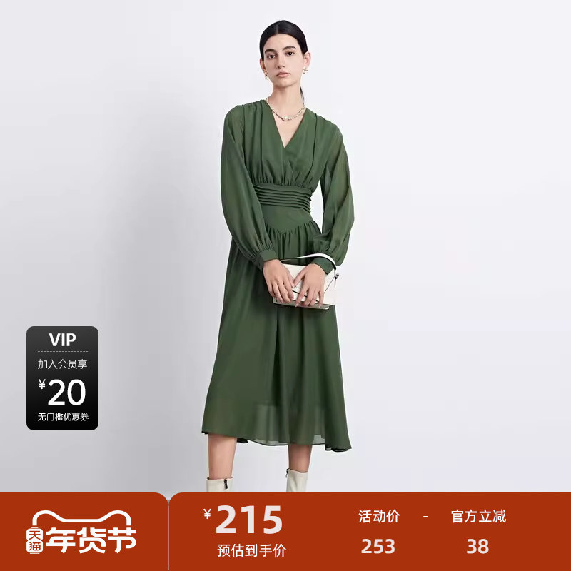 sdeer圣迪奥女装秋V领压褶垂坠雪纺长袖连衣裙S233Z12P8