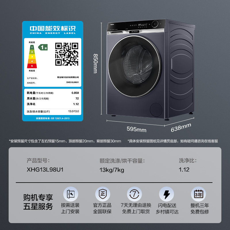 海尔滚筒洗衣机全家用自动热泵洗烘一体13kg大容量L98 fc