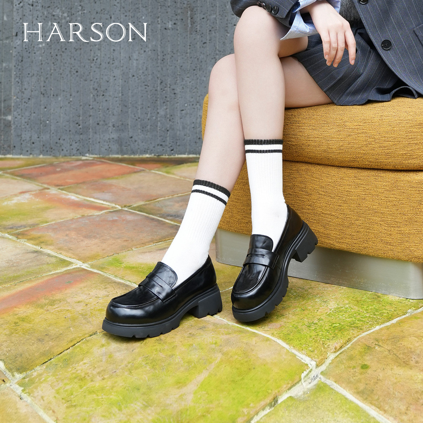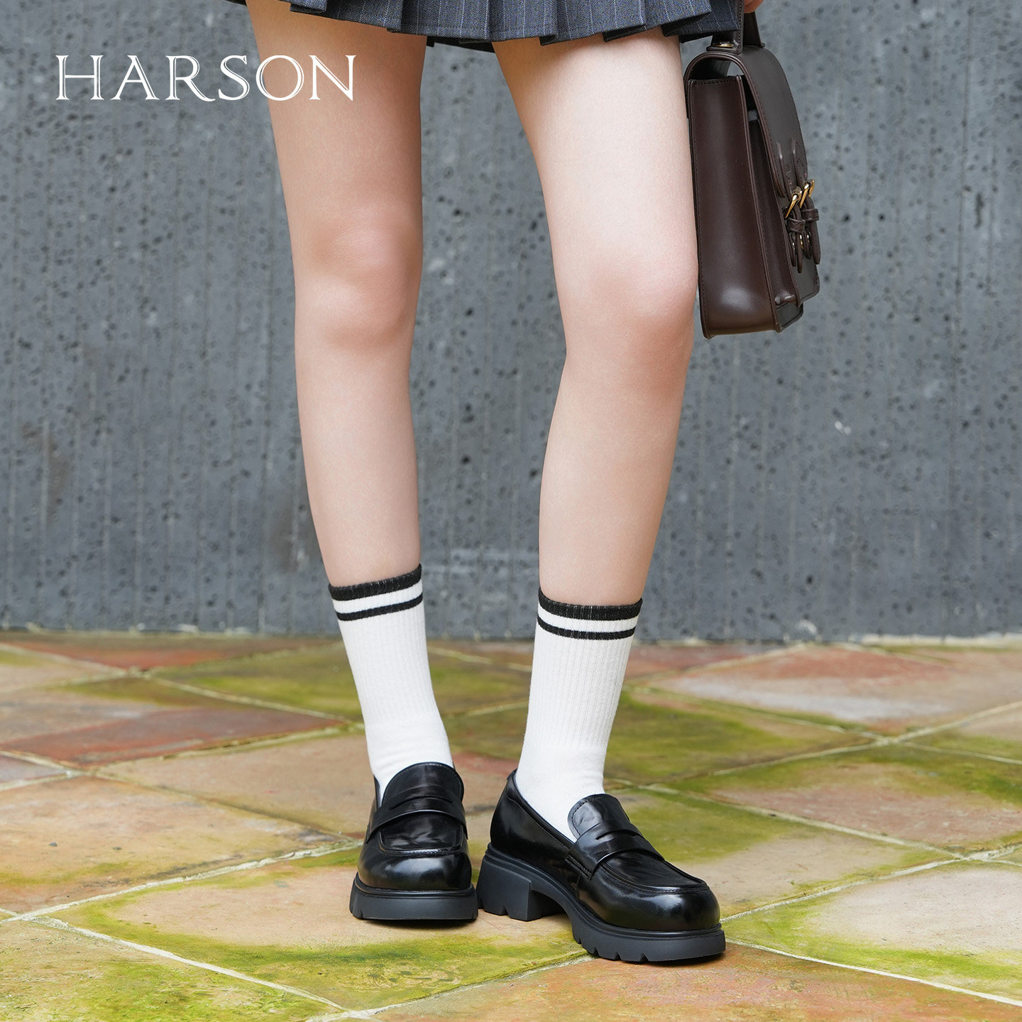 哈森经典学院风圆头粗跟乐福鞋女黑色厚底简约百搭单鞋HWL250142