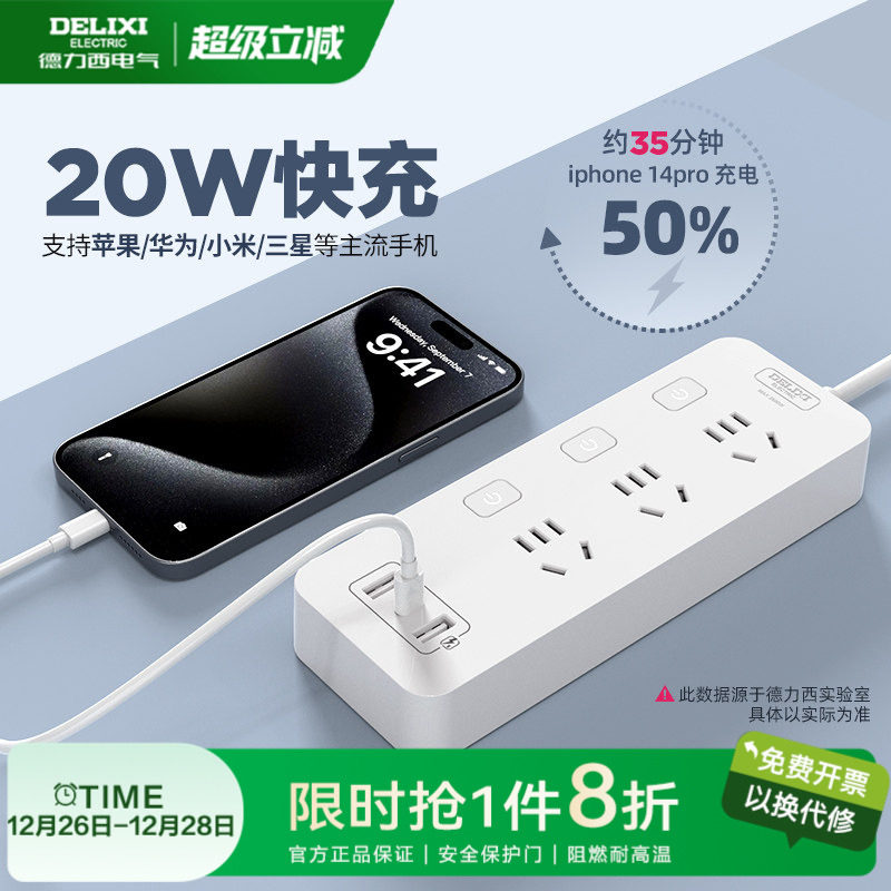 德力西插座USB插线板快充电插排多孔智能苹果家用充电器接拖线板