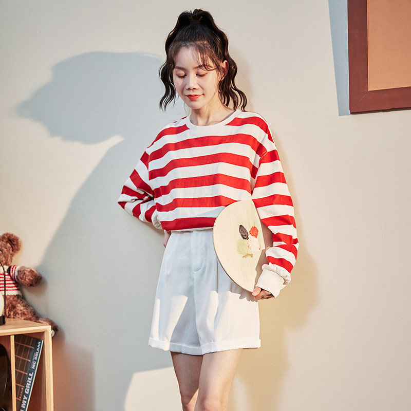 三福长袖上衣女2025新款秋冬季圆领内搭打底衫修身白色t恤女装