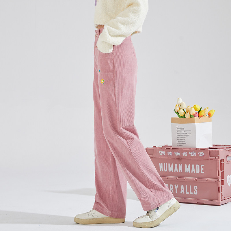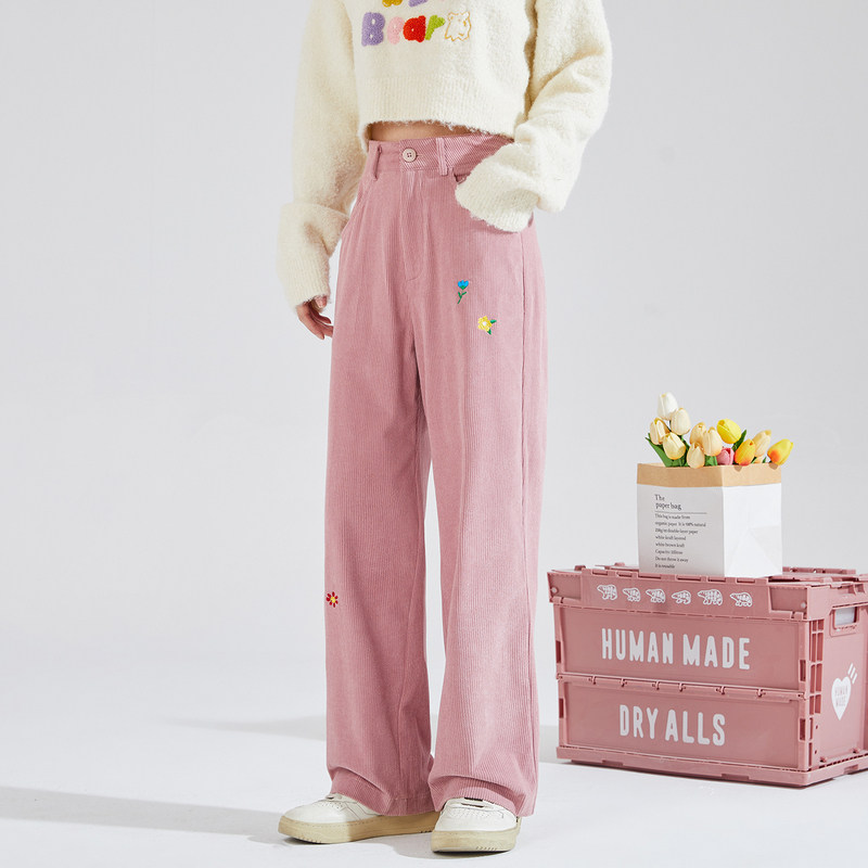 唐狮甜美灯芯绒阔腿长裤秋冬新精致绣花直筒休闲运动粉色裤子
