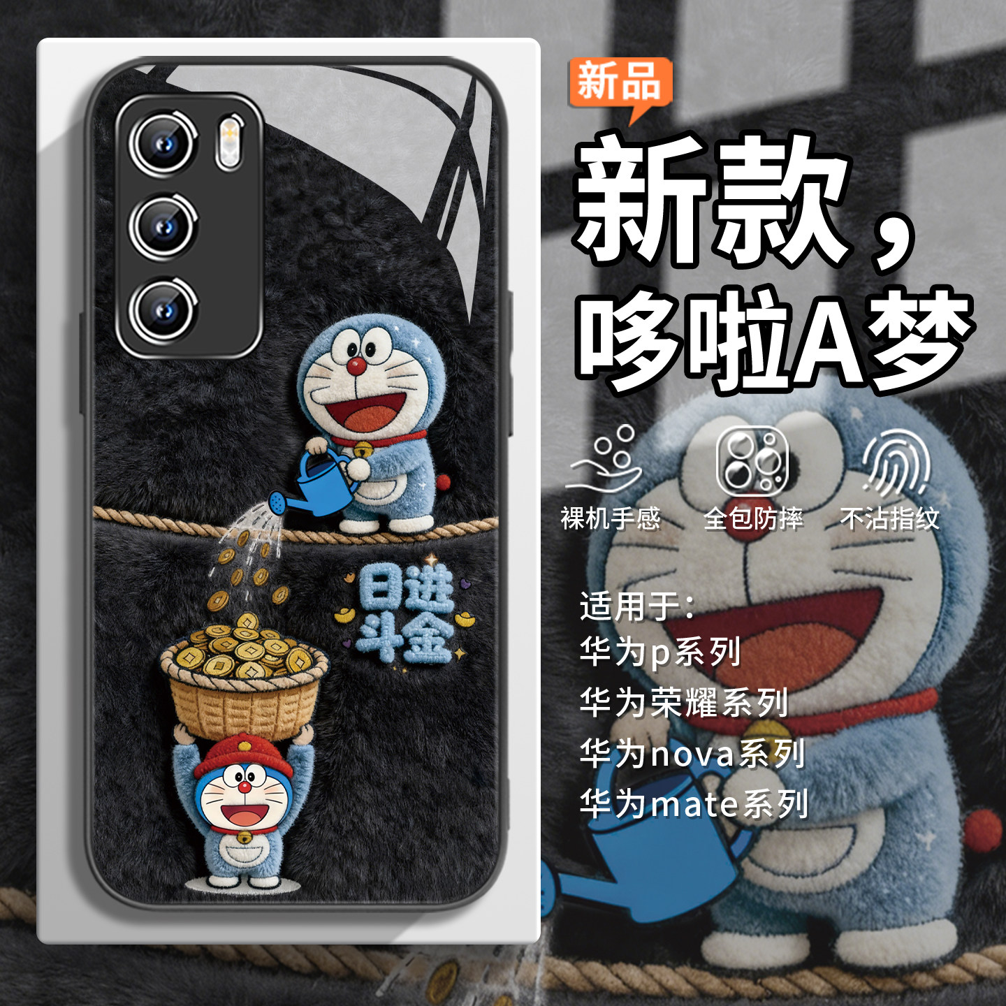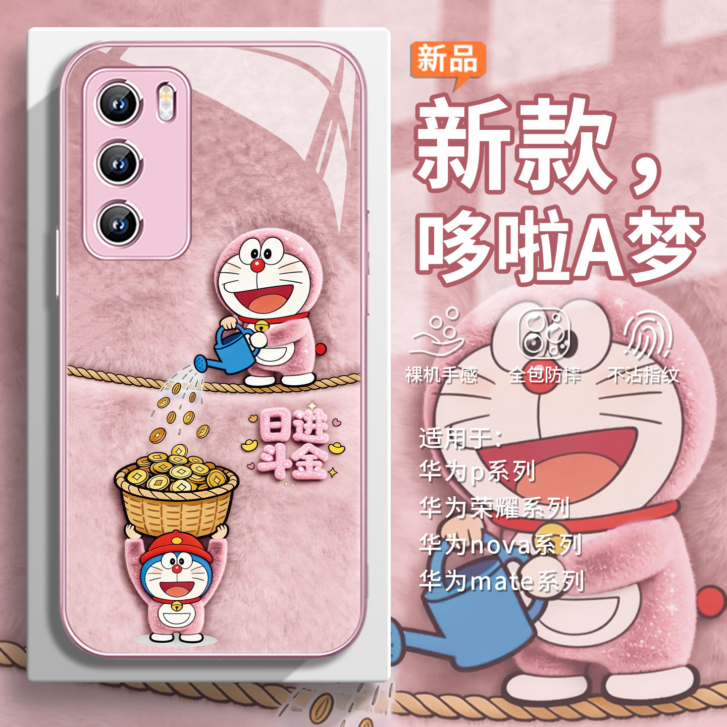 适用华为nova15ultra毛绒手机壳哆啦A梦荣耀500毛茸茸mate80招财pura70日进斗金magic8小叮当x70麻将x60i玻璃