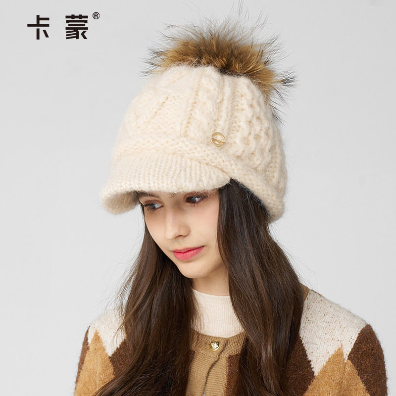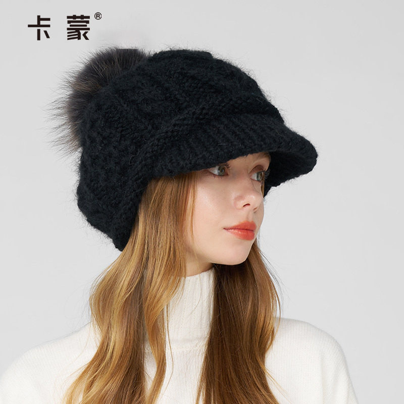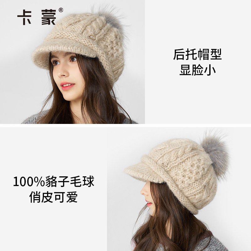卡蒙帽子女士冬可爱毛球针织帽加厚保暖贝雷帽防风防寒护耳毛线帽