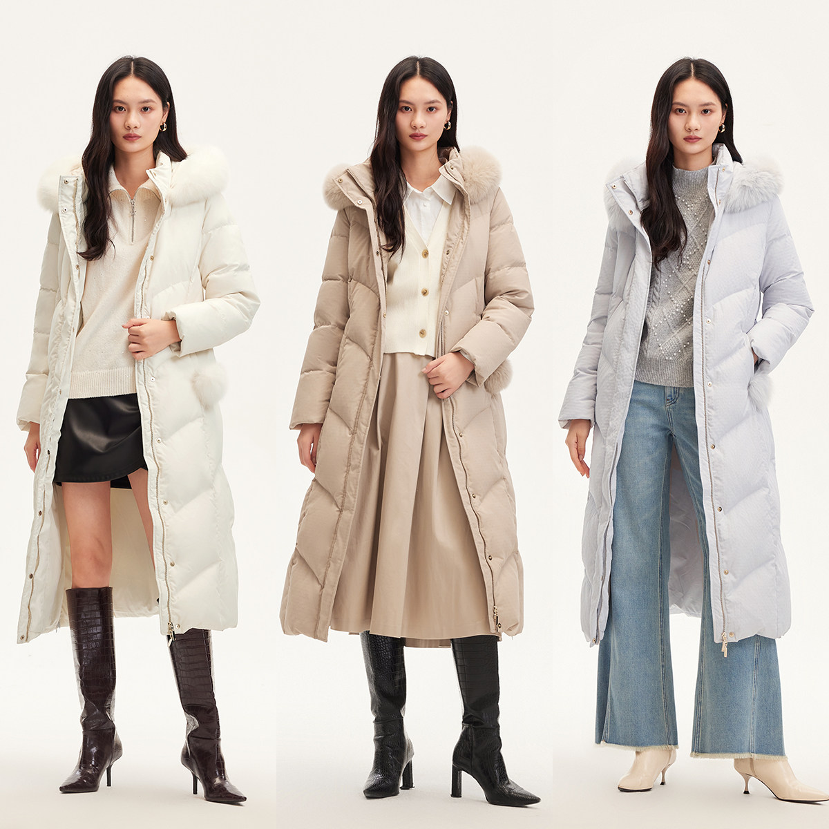 羽绒填充,柔软蓬松;长款版型,实用保暖