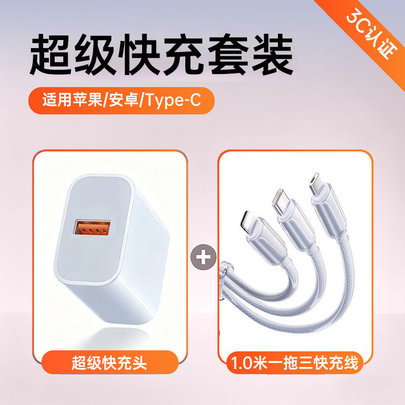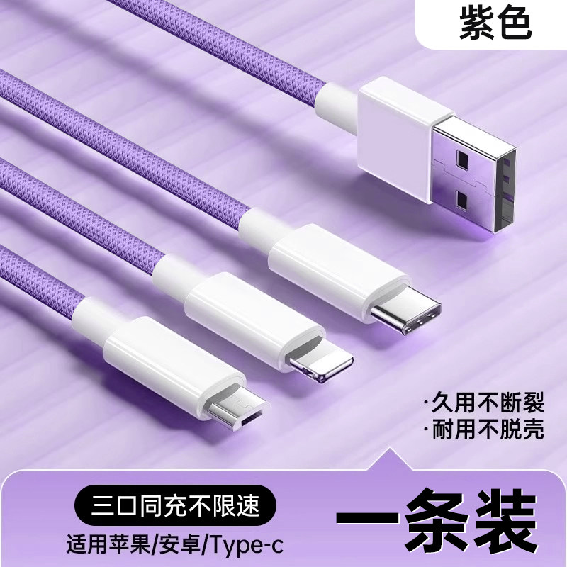 超级快充三合一数据线通用充电线适用苹果荣耀华为OPPO小米VIVO手机通用车载一拖三数据线透明芯片type-c带灯