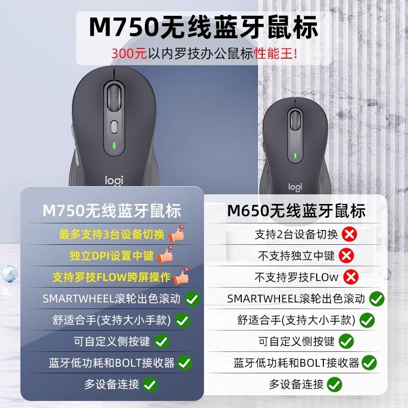 罗技M750M/L无线蓝牙鼠标办公电脑苹果笔记本办公女生优选系列233