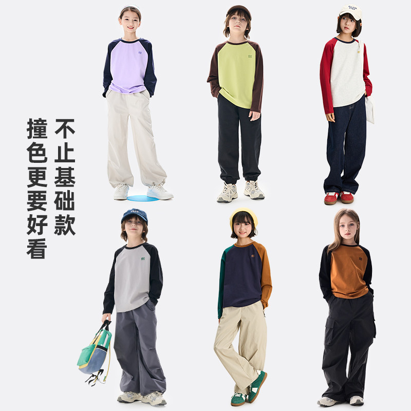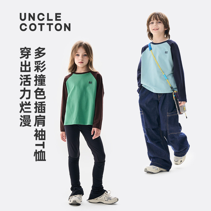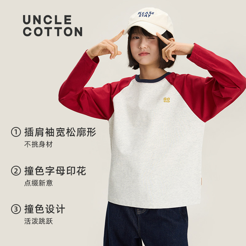 棉叔叔儿童秋冬长袖T恤中大童打底衫撞色插肩袖学院风T恤云柔棉T