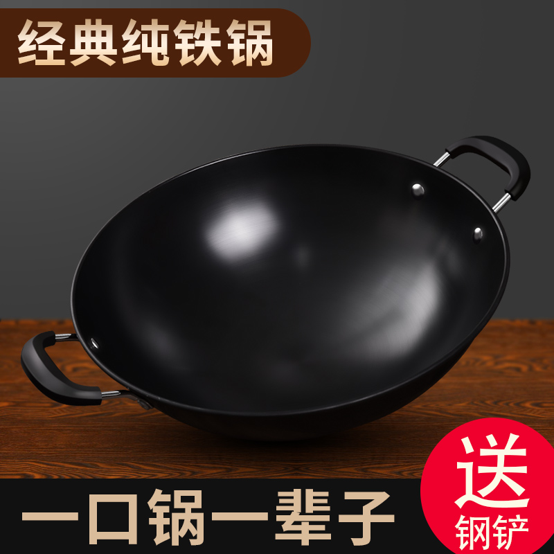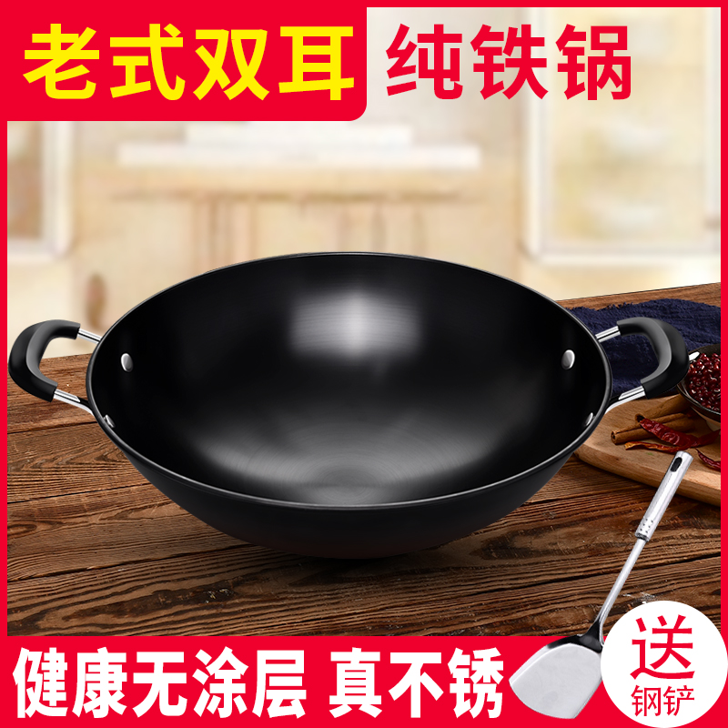双耳老式生铁锅大炒锅不粘锅煤气灶燃气灶专用铸铁炒菜锅具无涂层