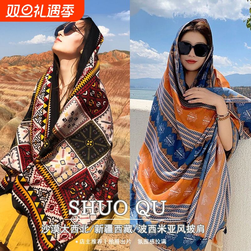 民族风围巾薄款披肩女云南青海草原旅游穿搭丝巾海边纱巾防晒西北