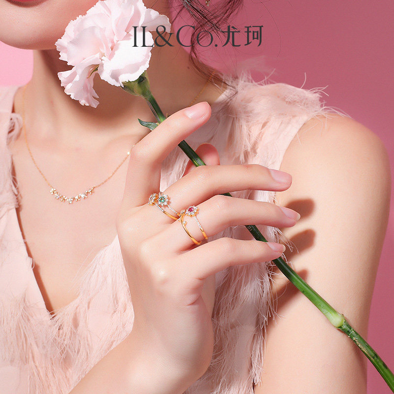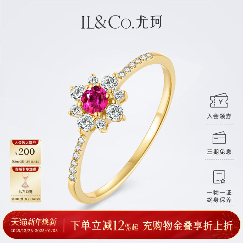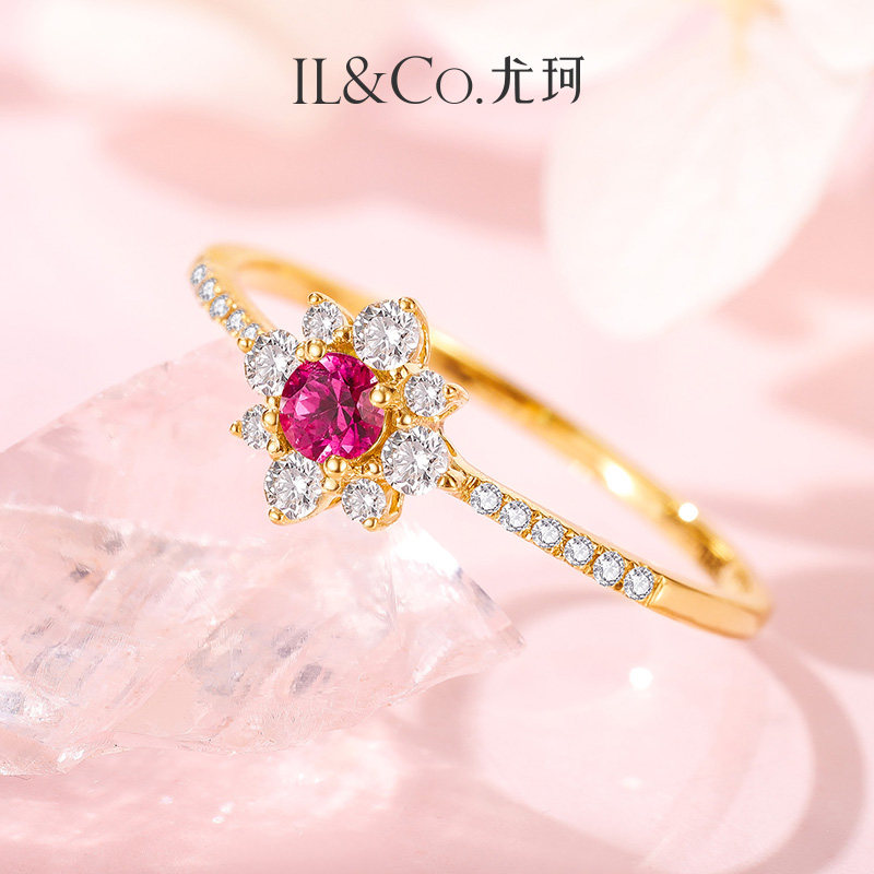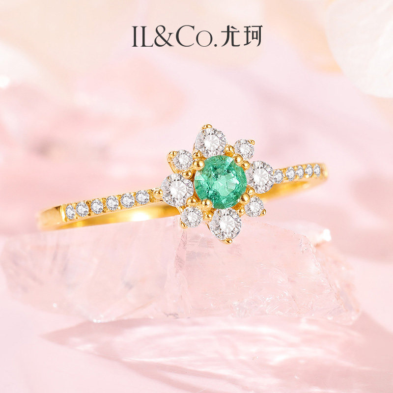 ILCO尤珂「生如夏花」黄18K金天然祖母绿戒指红宝石镶嵌钻石花型