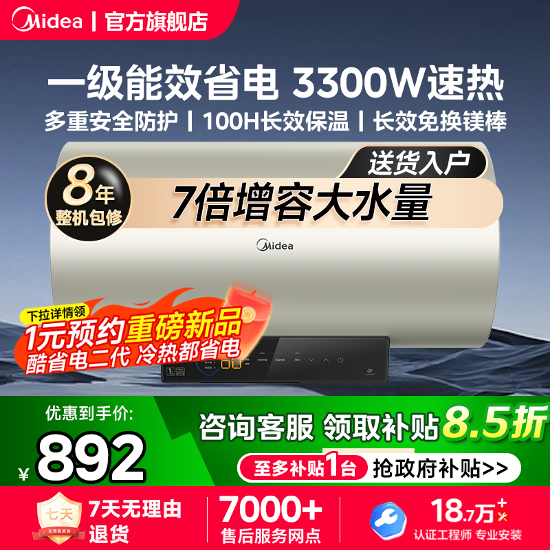 美的电热水器JE7Pro一级能效变频速热60L80升免换镁棒洗澡家用