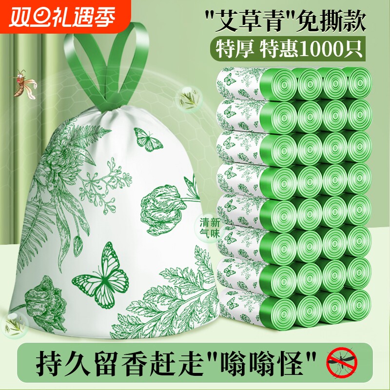 艾草垃圾袋防臭家用加厚手提式抽绳厨房专用耐用大卷塑料袋不易破