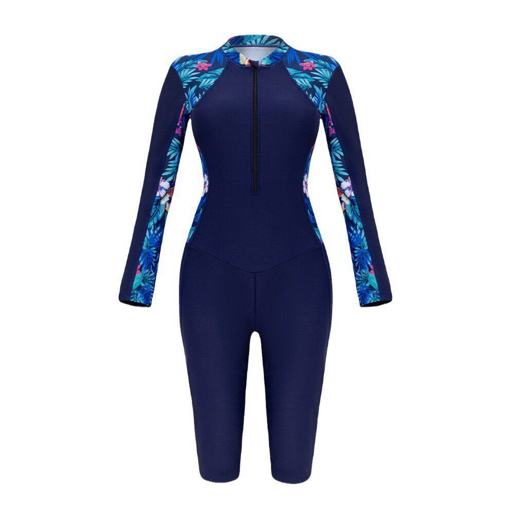欧美泳衣女外贸连体长袖冲浪服新款平角五分裤潜水服保守大码泳装