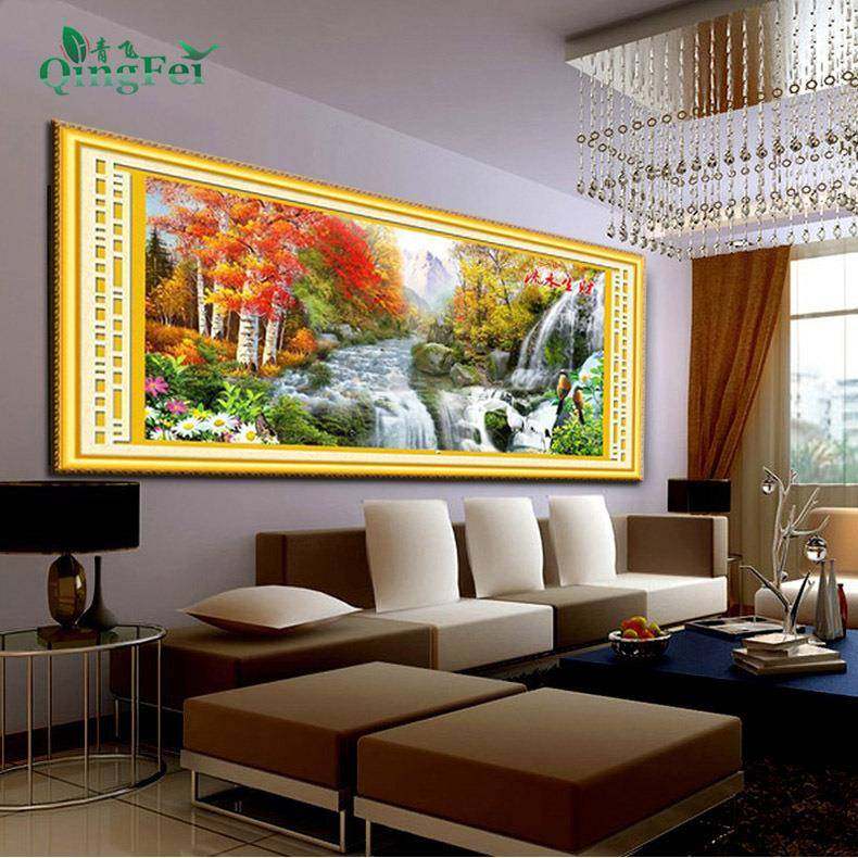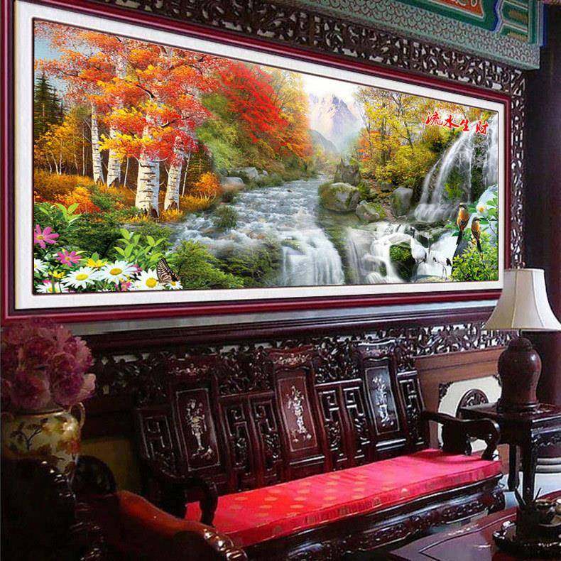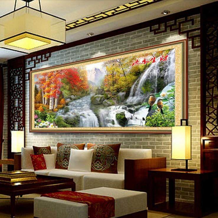 青飞财源滚滚流水生财鸟语花香十字绣客厅山水风景金色富锦枫林