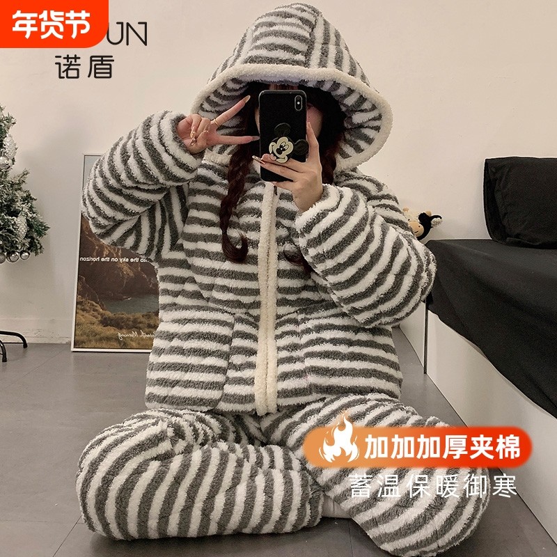 条纹睡衣女秋冬季珊瑚绒加厚三层夹棉冬天2025新款连帽女士家居服