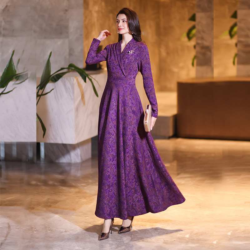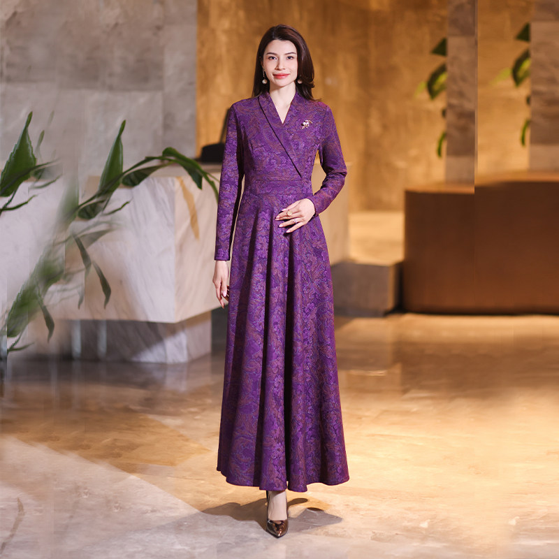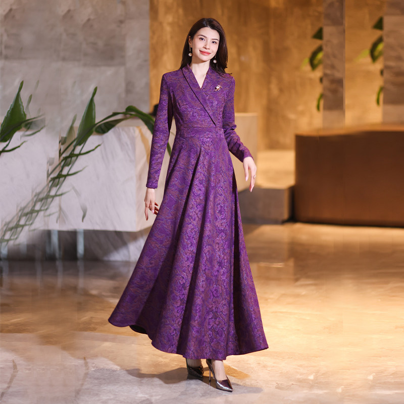 2025秋冬新款长袖V领纯色大摆连衣裙妈妈款修身显瘦小个子长裙子