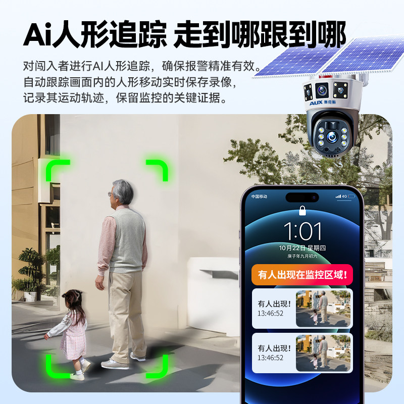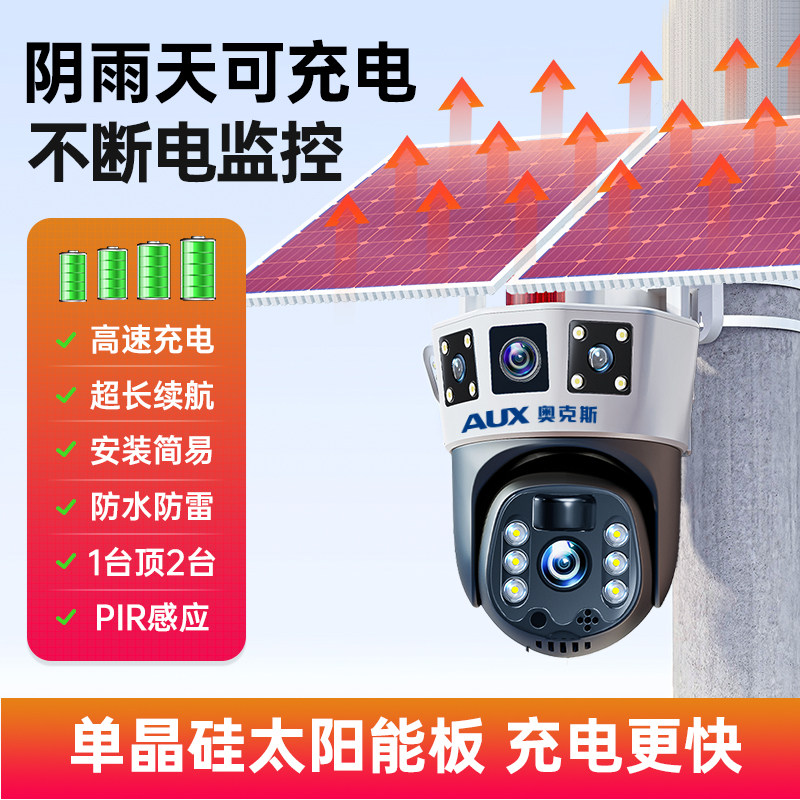奥克斯太阳能摄像头监控户外360度无死角手机远程室外4G网络夜视