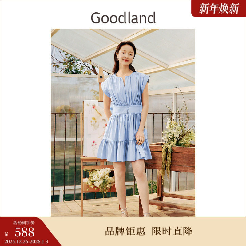 Goodland美地女装夏季时尚法式V领碎褶无袖V领连衣裙