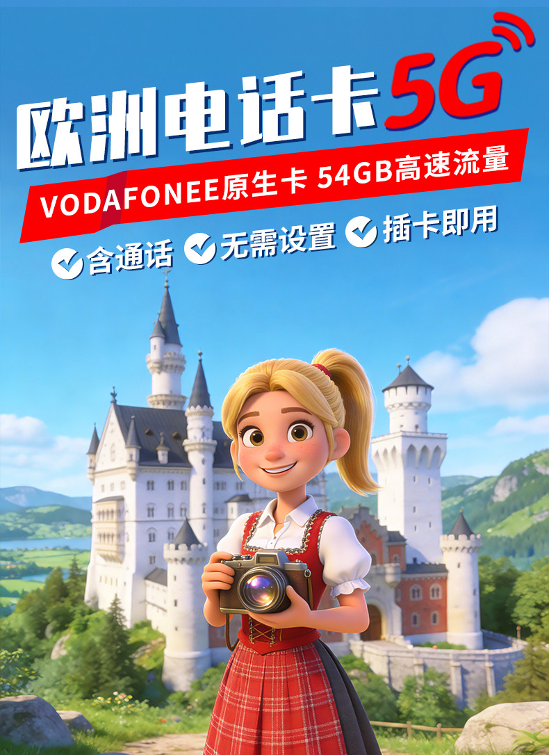 欧洲电话卡德国欧盟多国沃达丰通用5g高速流量手机上网卡机场自取