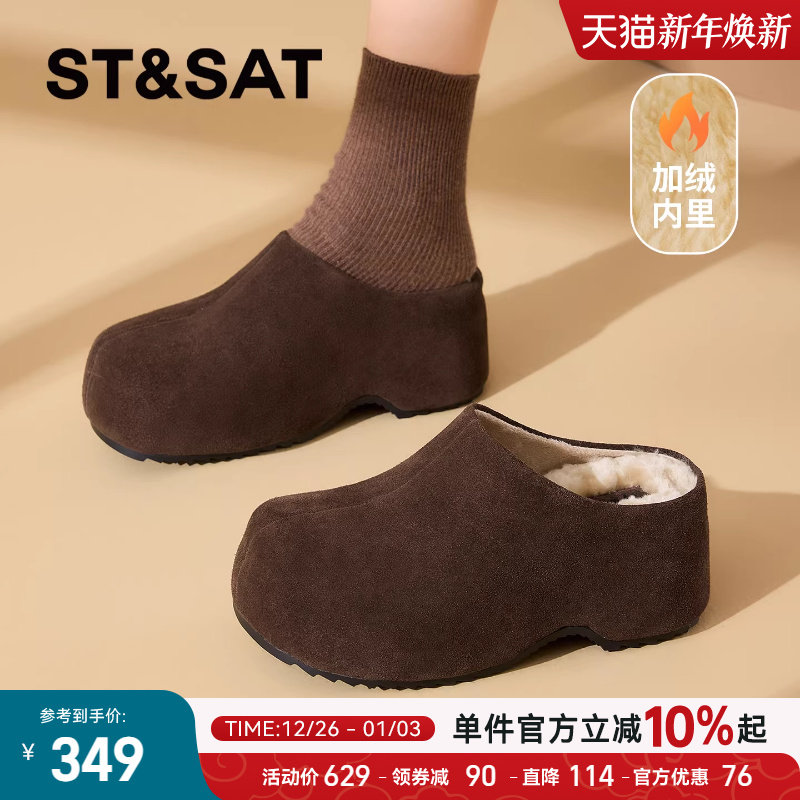 星期六厚底勃肯鞋女款2025新款冬季加绒包头真皮女鞋复古增高棉鞋