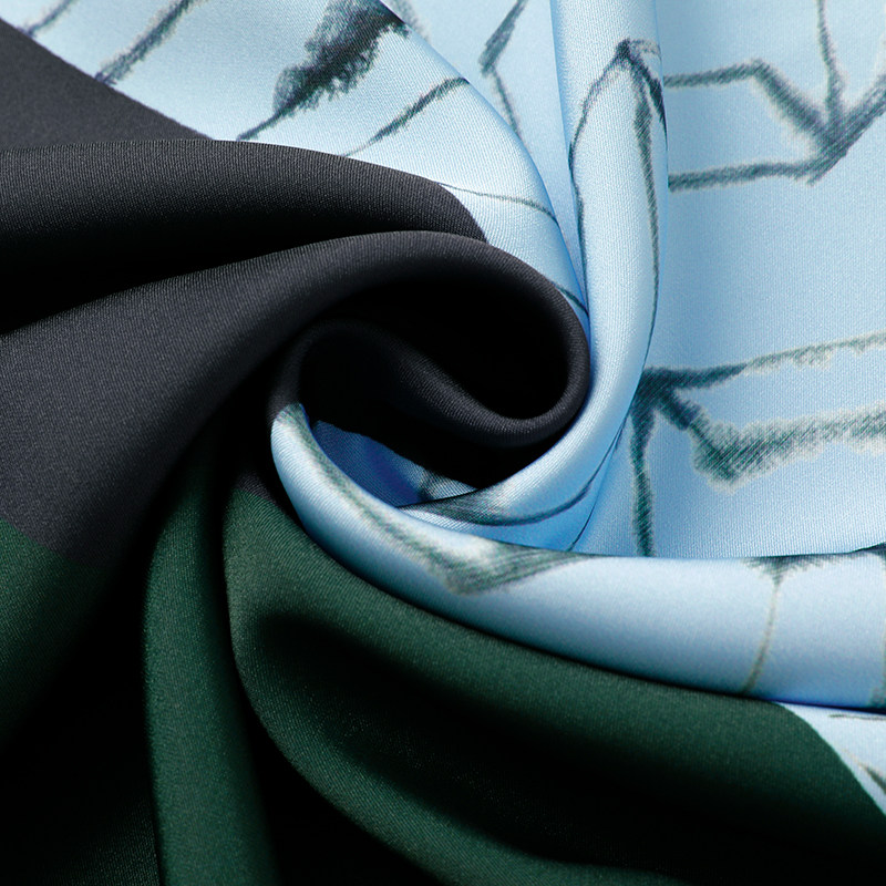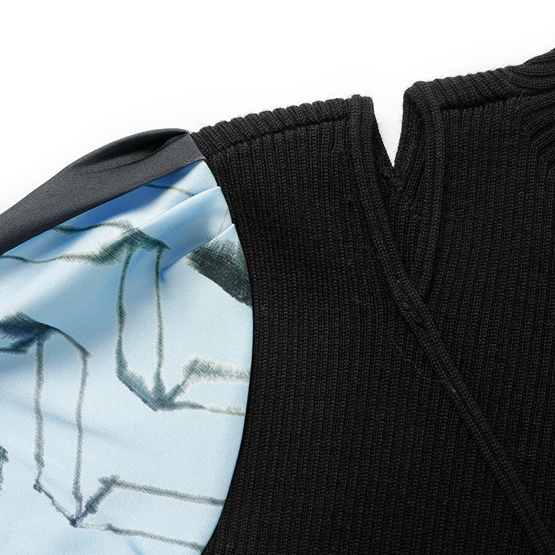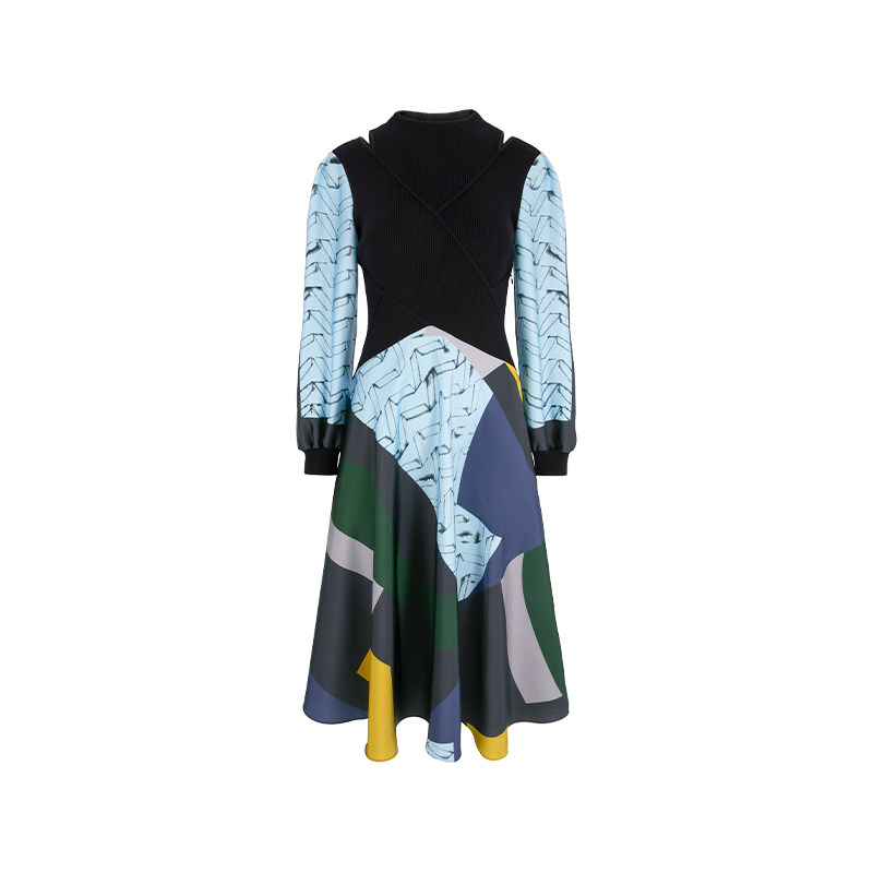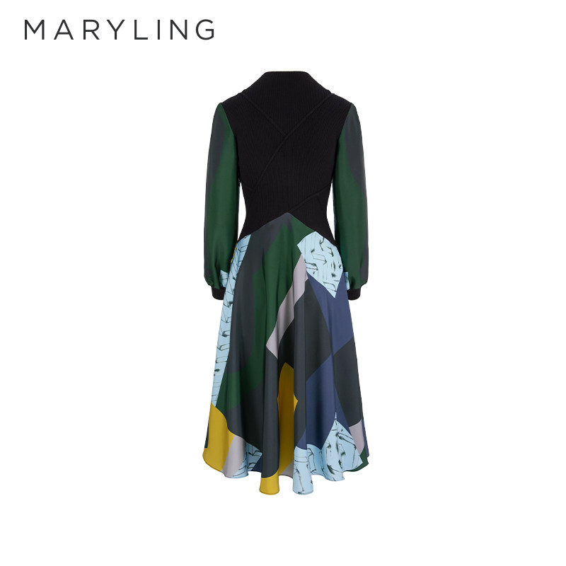 MARYLING玛俪琳秋季新品撞色小高领中长裙艺术针梭织印花连衣裙