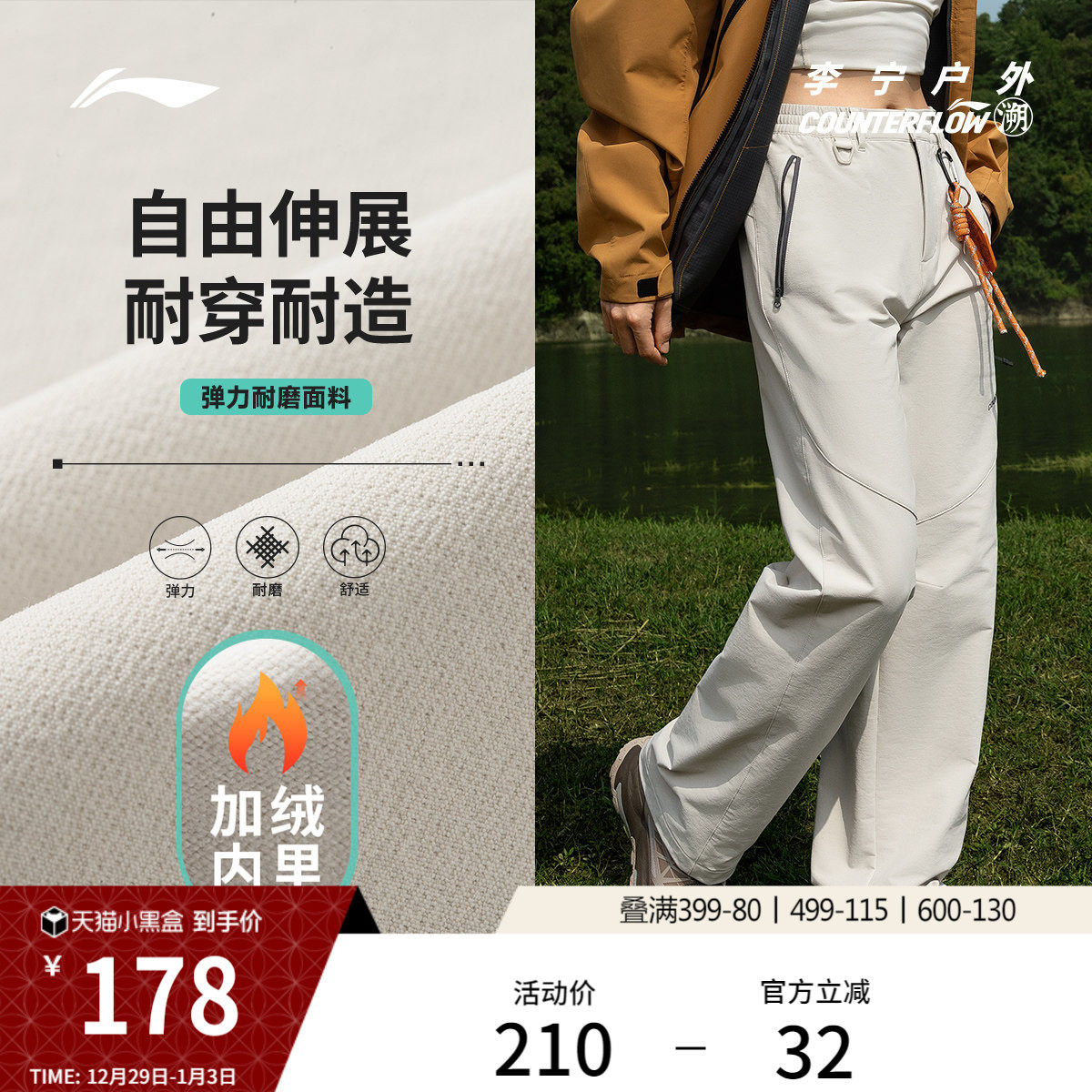 李宁户外CF溯丨运动裤女士加绒保暖反光裤子冬季直筒梭织运动裤