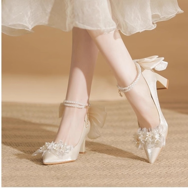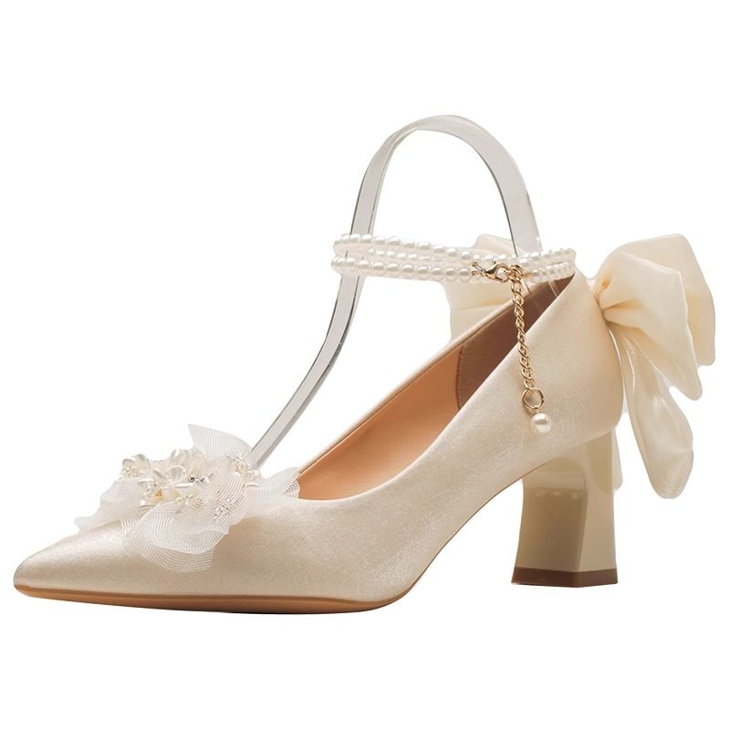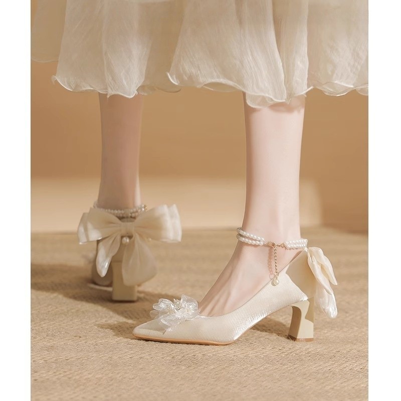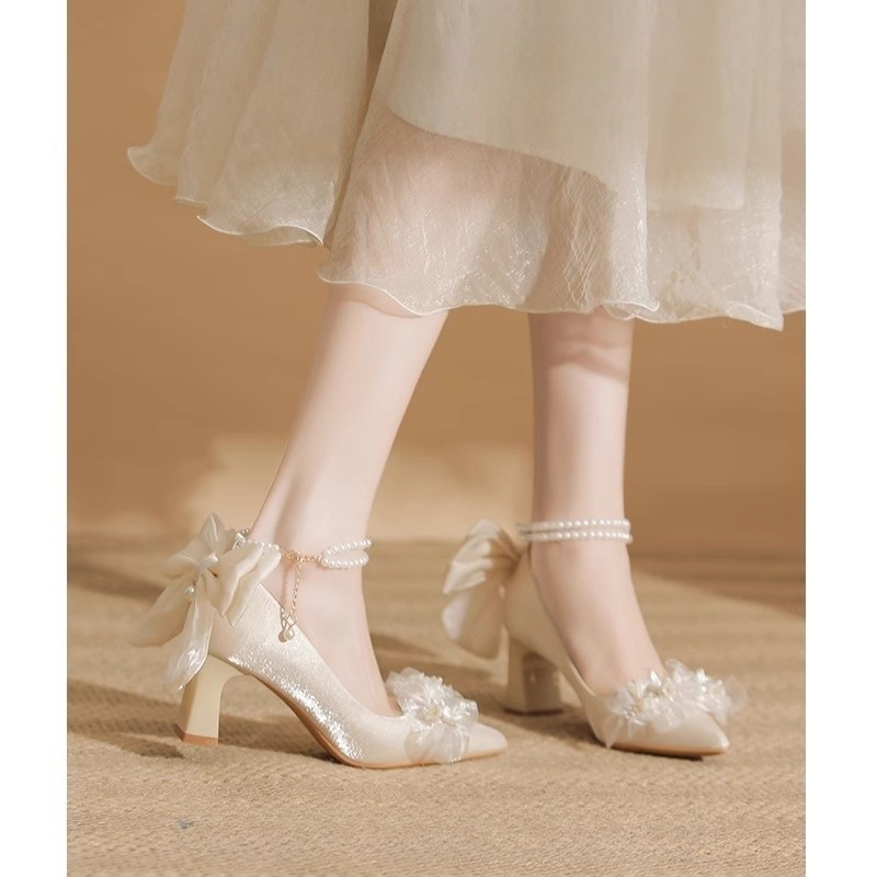 法式高跟鞋女订婚禾秀婚纱两穿粗跟不累脚绝美珍珠绑带新娘鞋尖头