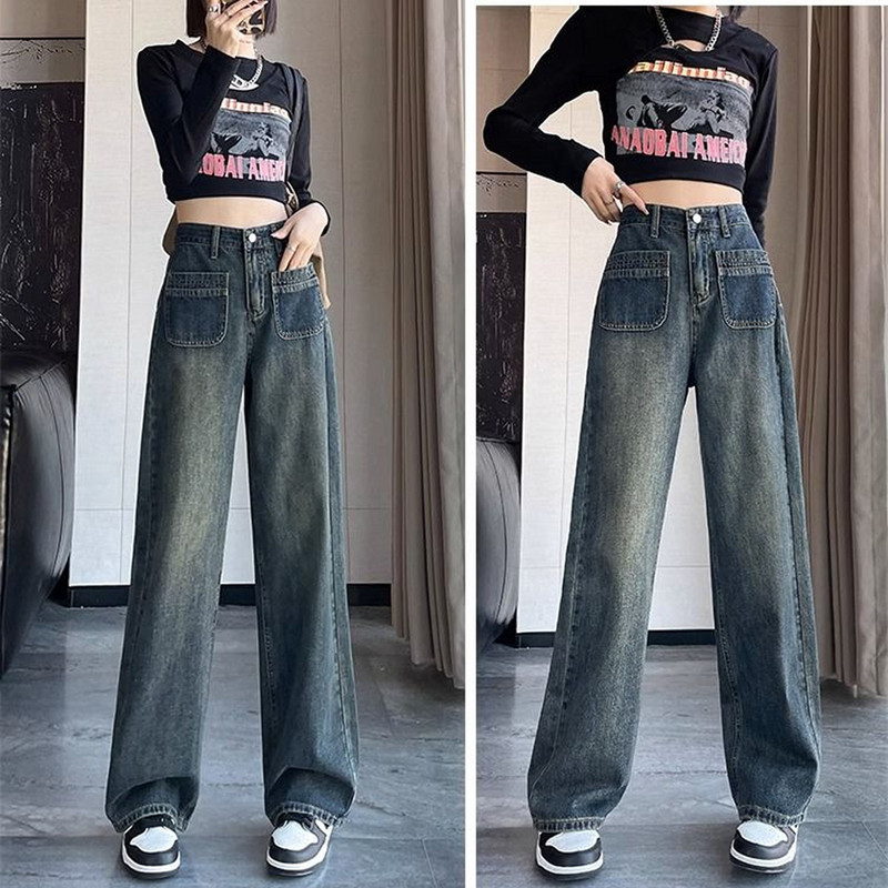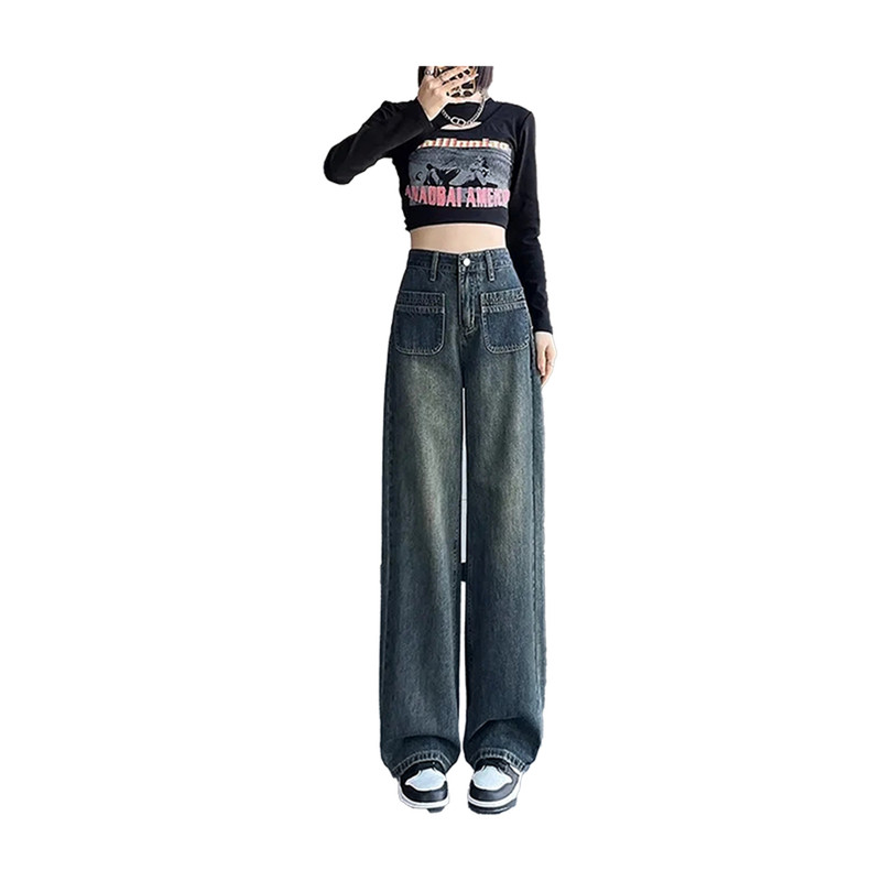 四面弹丹宁色牛仔阔腿裤25年新款宽松显瘦牛仔长裤89173