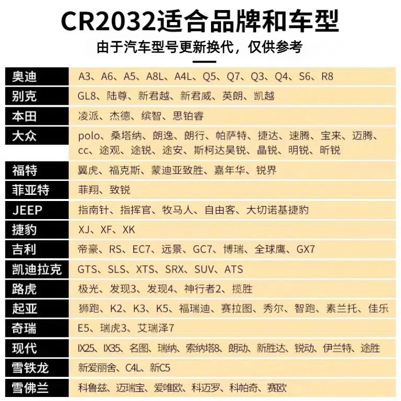 CR2032汽车钥匙遥控器纽扣电池适用宝马奔驰奥迪大众本田丰田通用