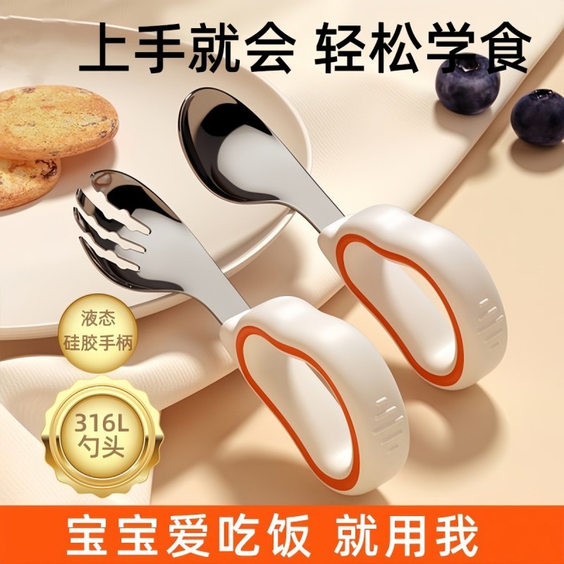 316L不锈钢儿童勺子辅食勺训练叉勺弯头勺叉自主学吃饭餐具宝宝学