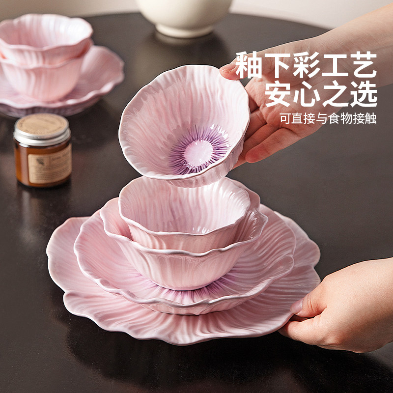 奶油风陶瓷碗家用卡通菜盘子可爱米饭碗汤碗釉下彩儿童餐具耐高温