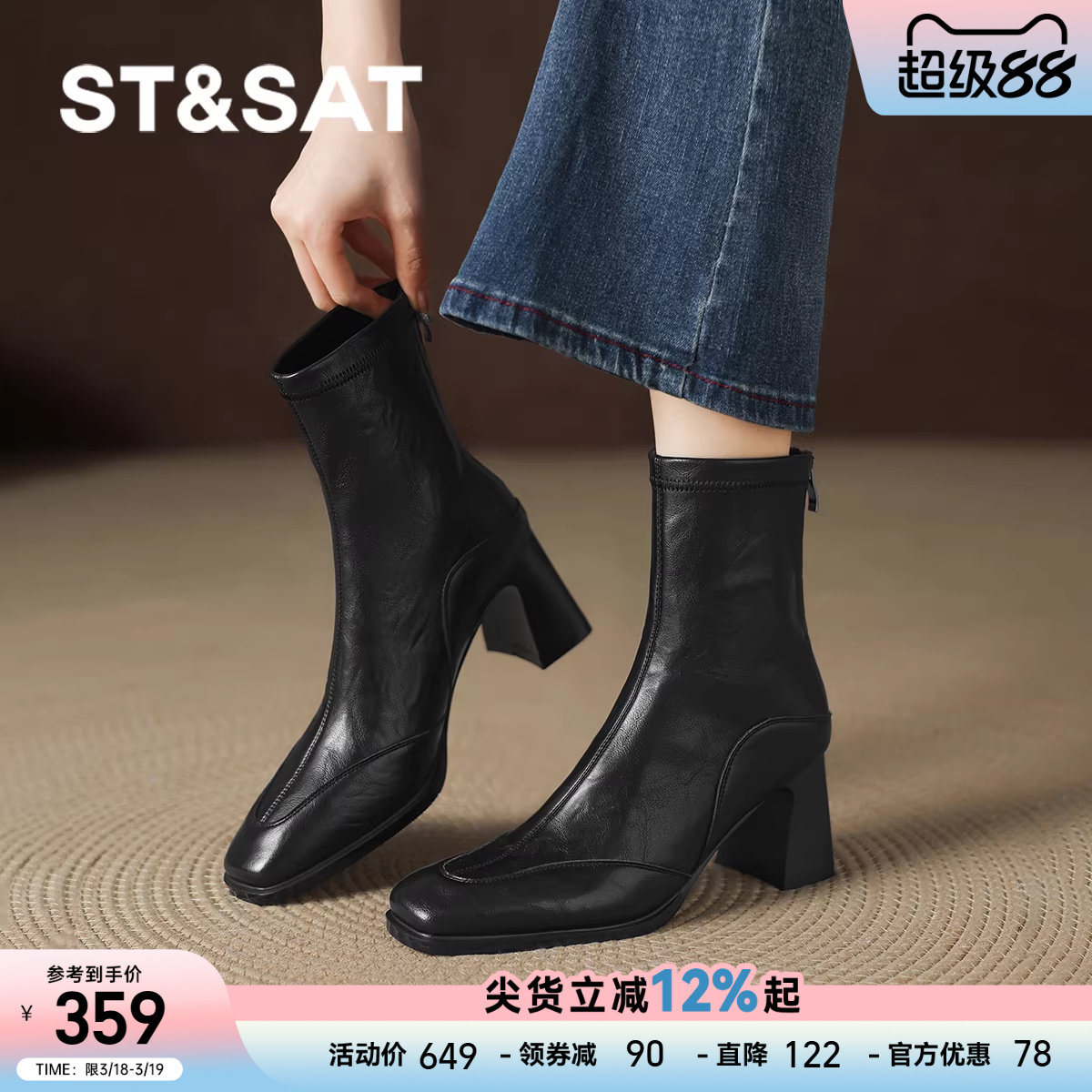 星期六高跟短靴女2025秋冬新款法式气质粗跟瘦瘦靴黑色高级感靴子