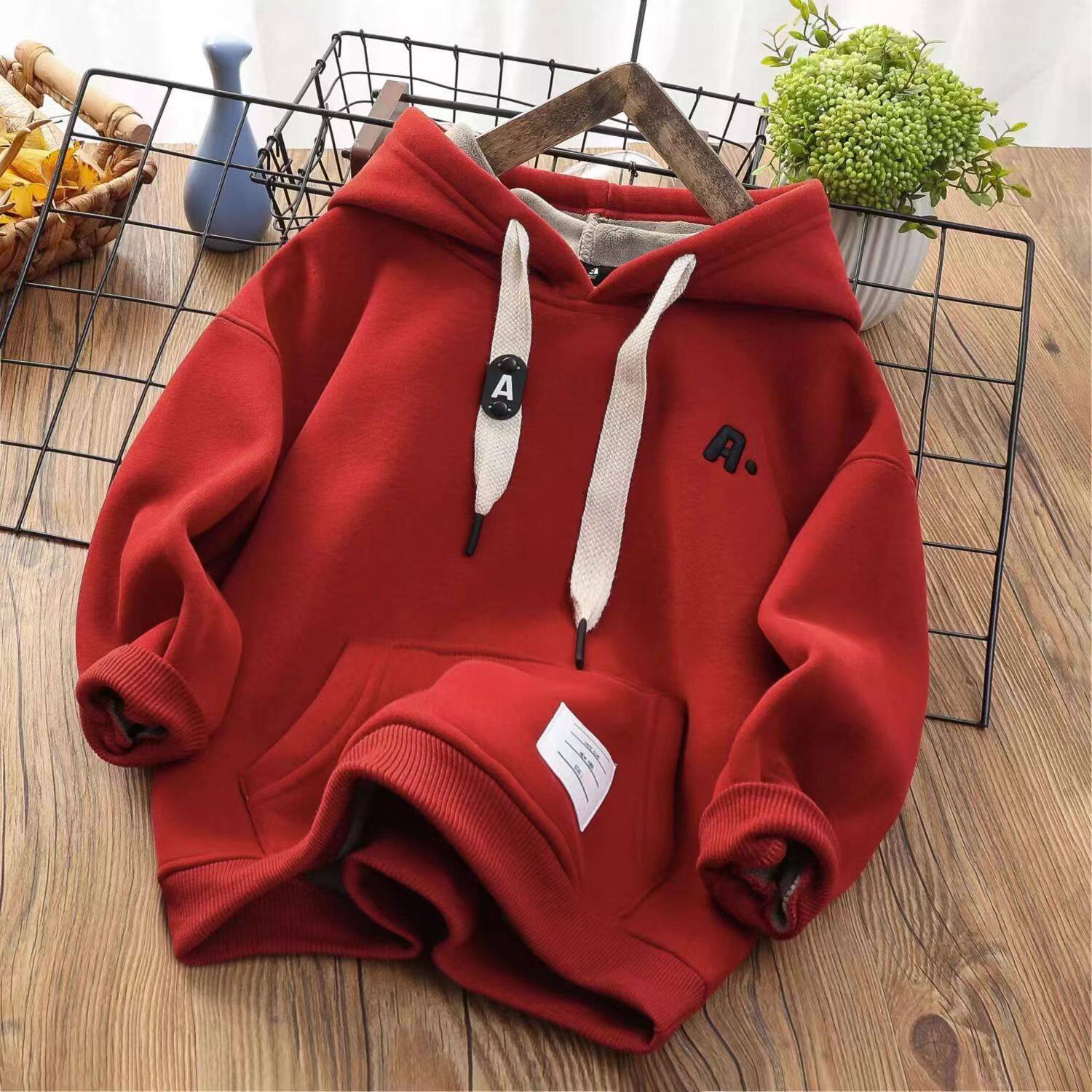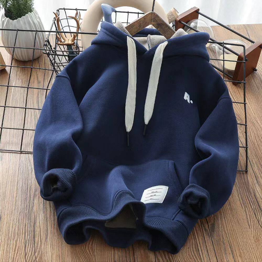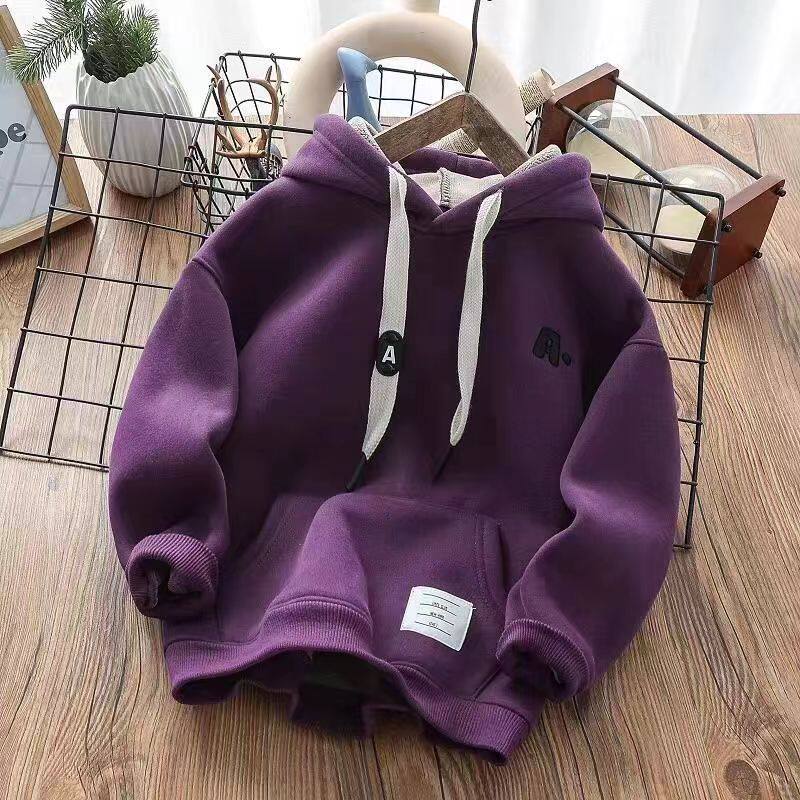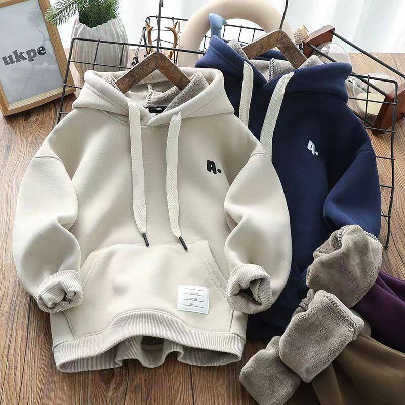 男童加厚卫衣儿童一体绒字母印花连帽上衣中大童保暖绒衫休闲百搭