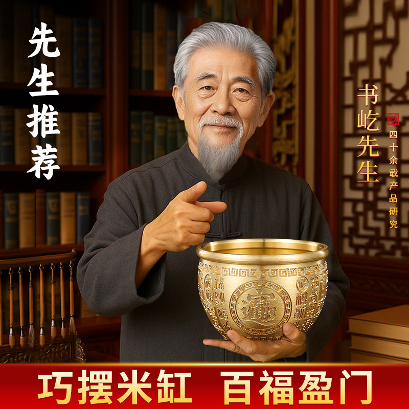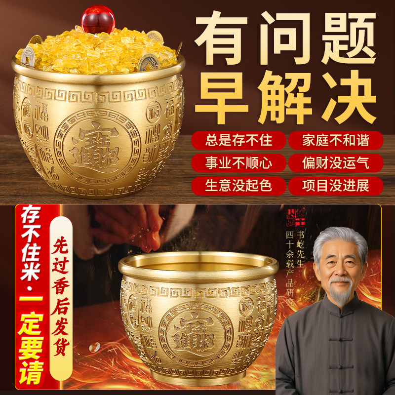 百福铜缸黄铜米缸摆件招财进宝聚宝盆聚财福客厅装饰品存钱罐水晶