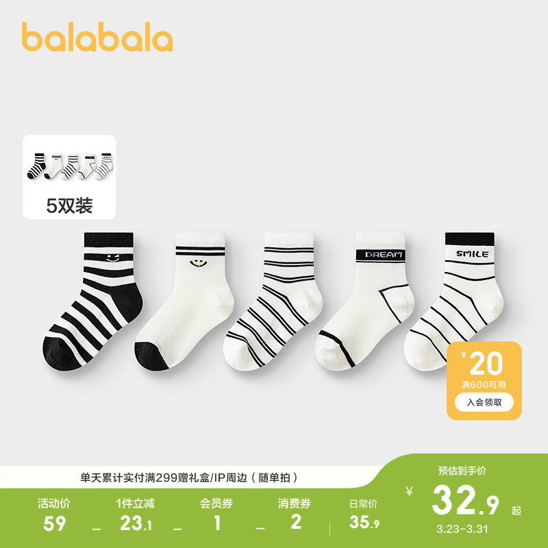 巴拉巴拉男童袜子儿童网眼袜夏季薄款透气中幼童中筒袜舒适五双装