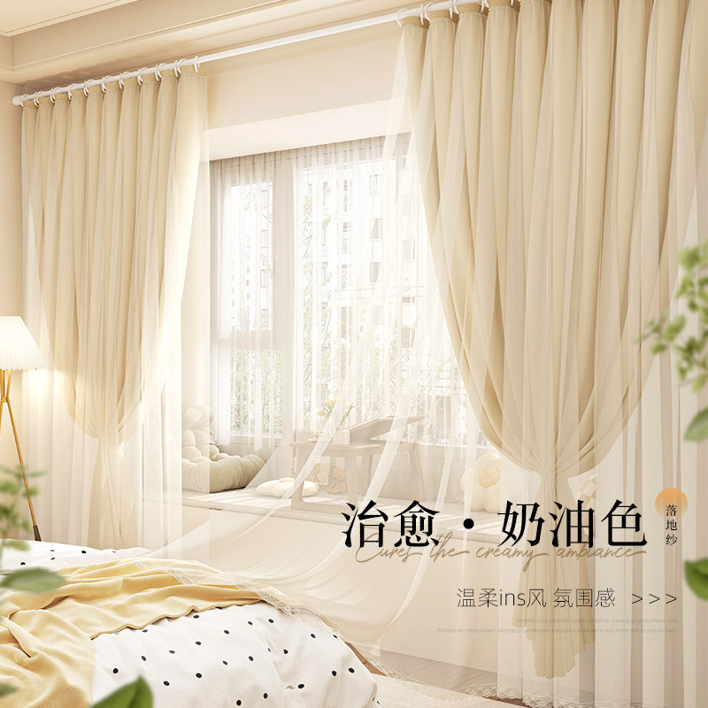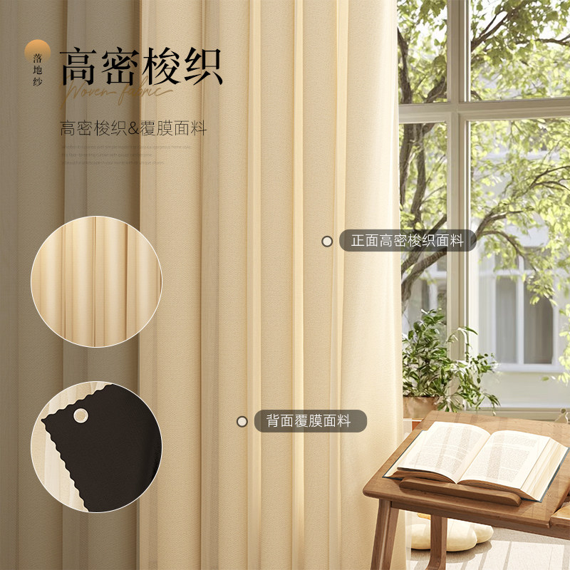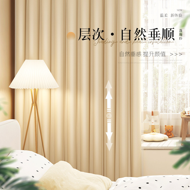 窗帘免打孔安装挂钩法式蕾丝阳台客厅隔断高级纯色落地帘伸缩杆新