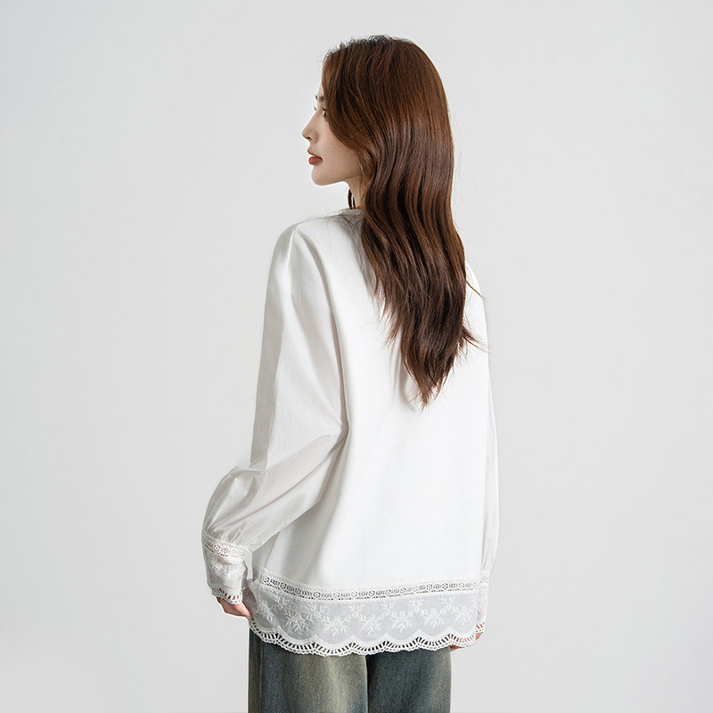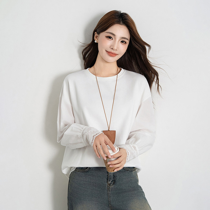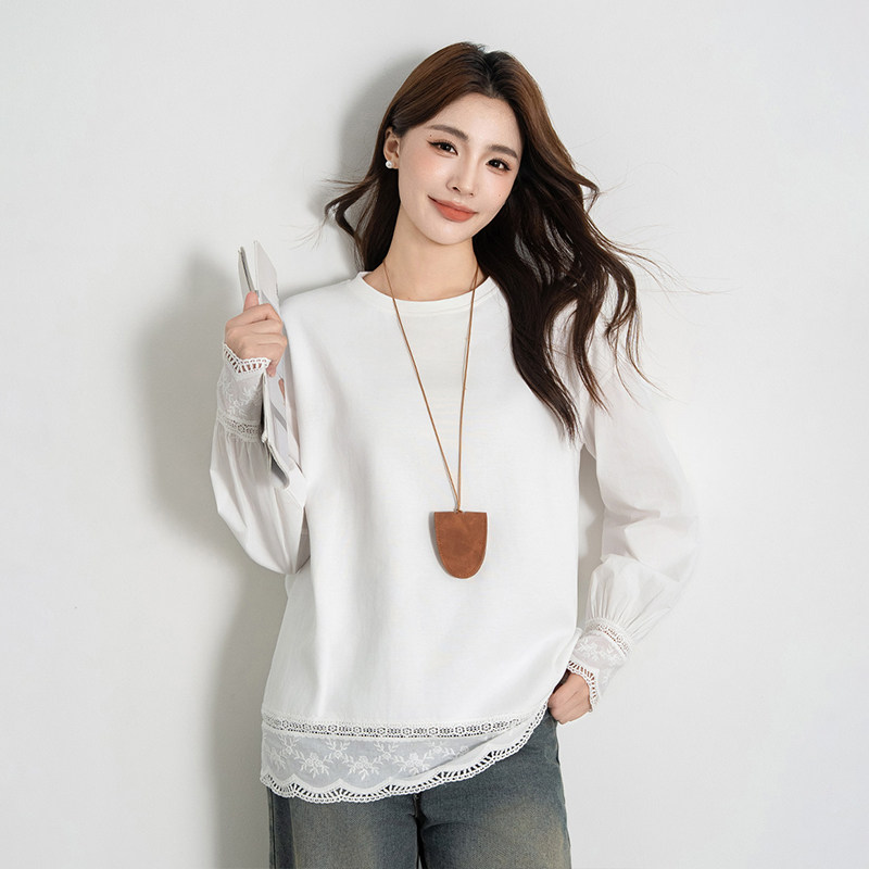 热风女士简约文艺森女风拼接蕾丝T恤秋季宽松休闲甜美百搭长袖T恤
