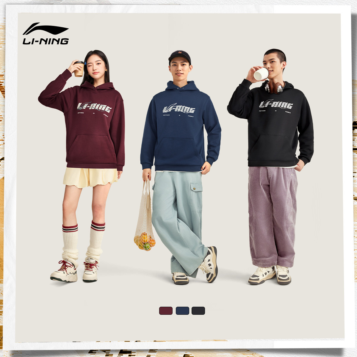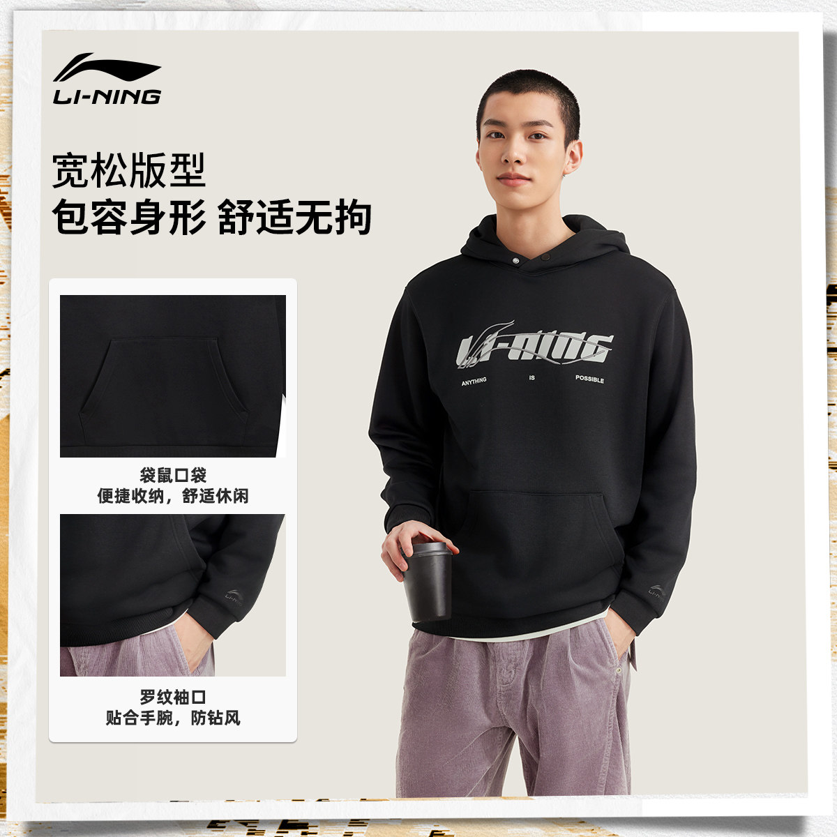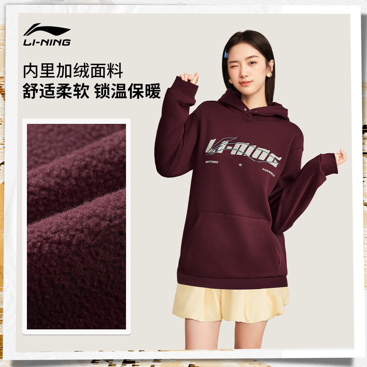 李宁加绒卫衣女士冬季官方新款宽松情侣松弛感上衣男士保暖运动服