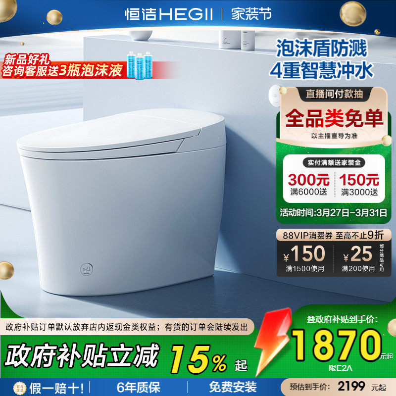 【政府补贴】恒洁轻智能马桶座圈加热坐便器零压泡沫盾防溅E2A