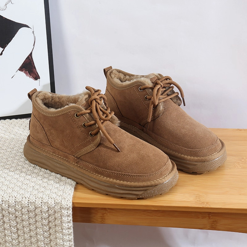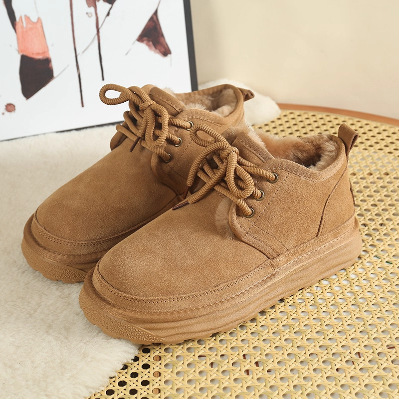 厚底真皮保暖防滑东北系带棉鞋女2025冬季新款皮毛一体磨砂雪地靴